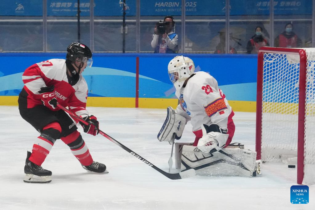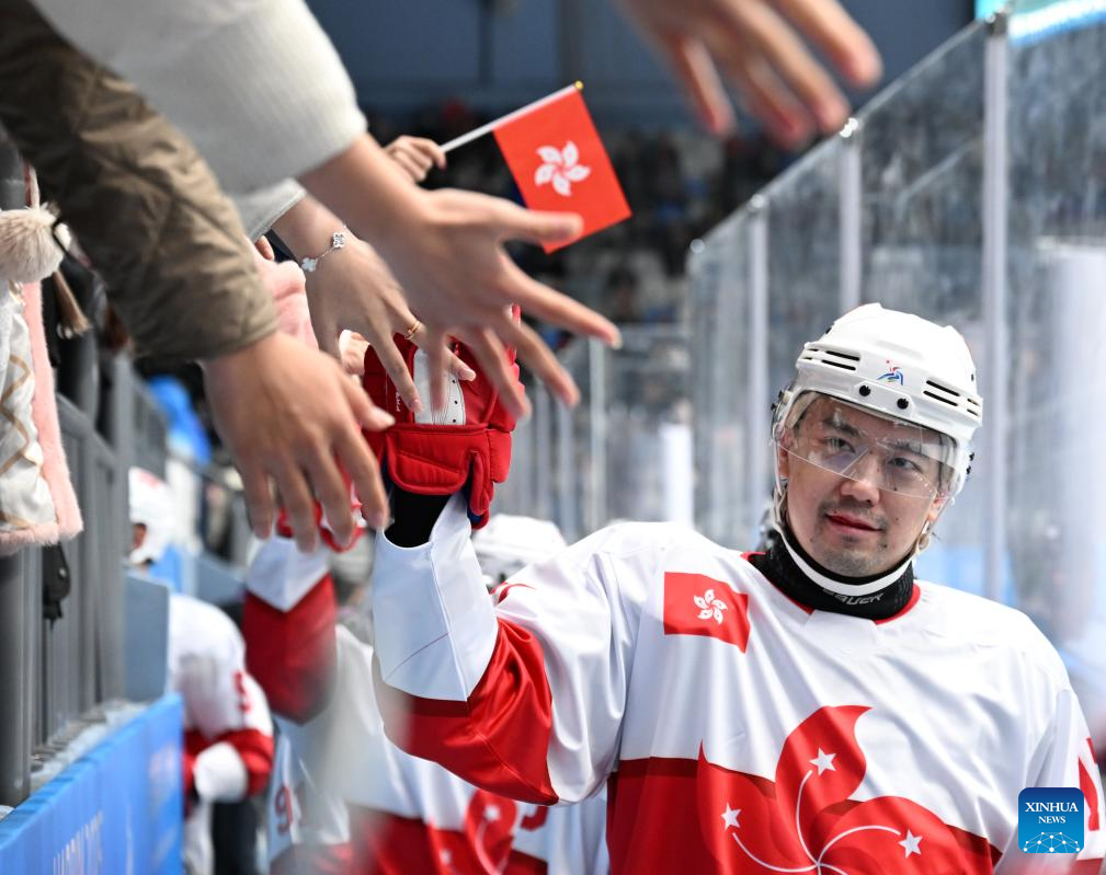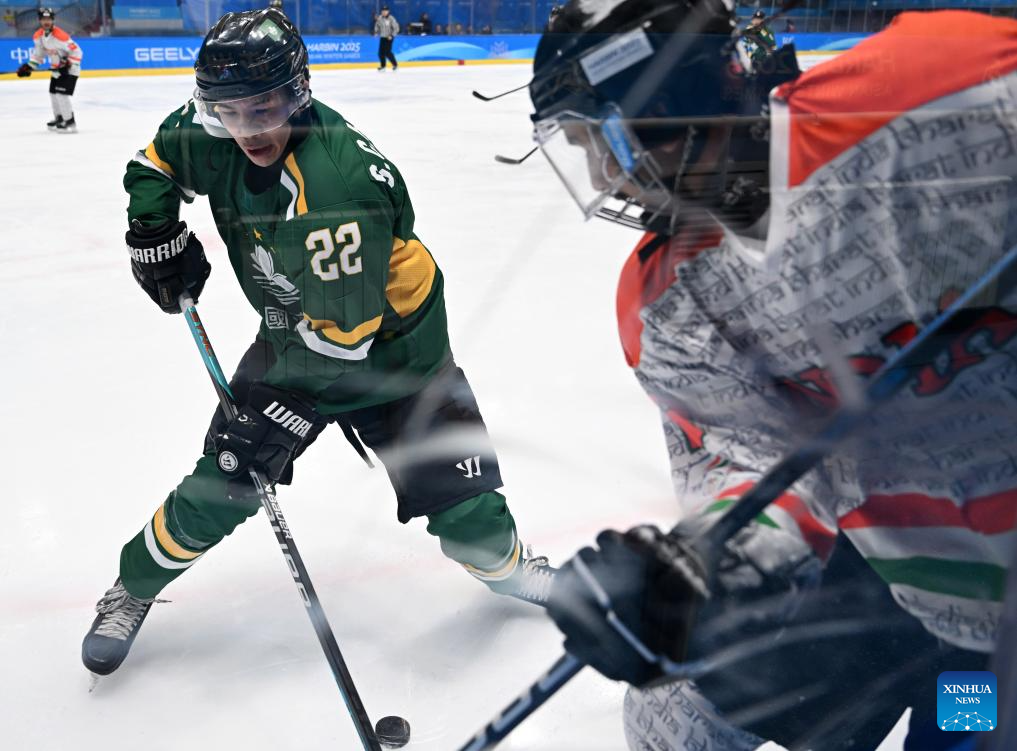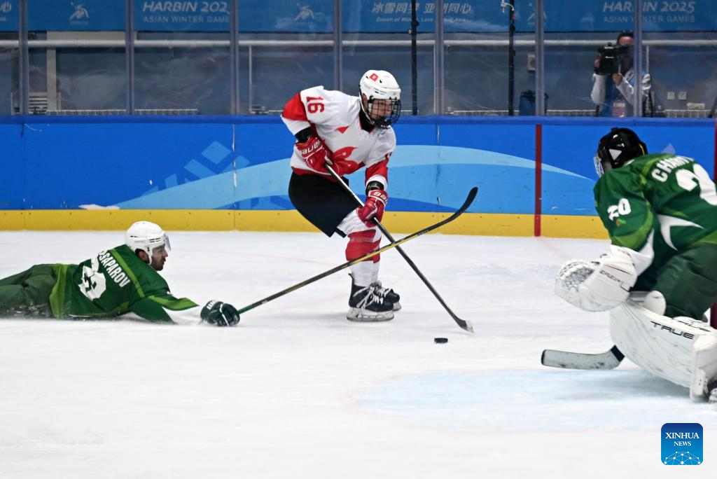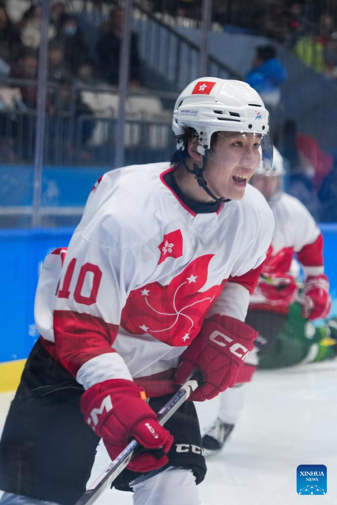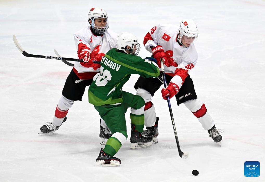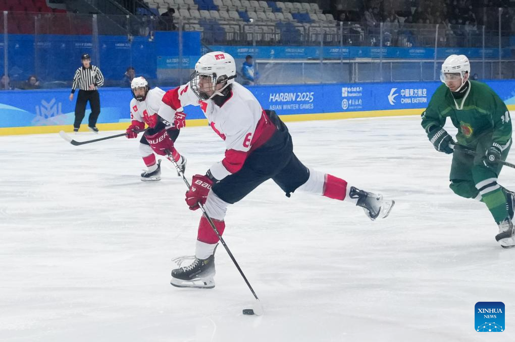 Yam Yau (C) of China's Hong Kong competes during the men's ice hockey group C match between Turkmenistan and China's Hong Kong at 2025 Asian Winter Games in Harbin, northeast China's Heilongjiang Province, on Feb. 9, 2025. (Xinhua/Li Jianan)
