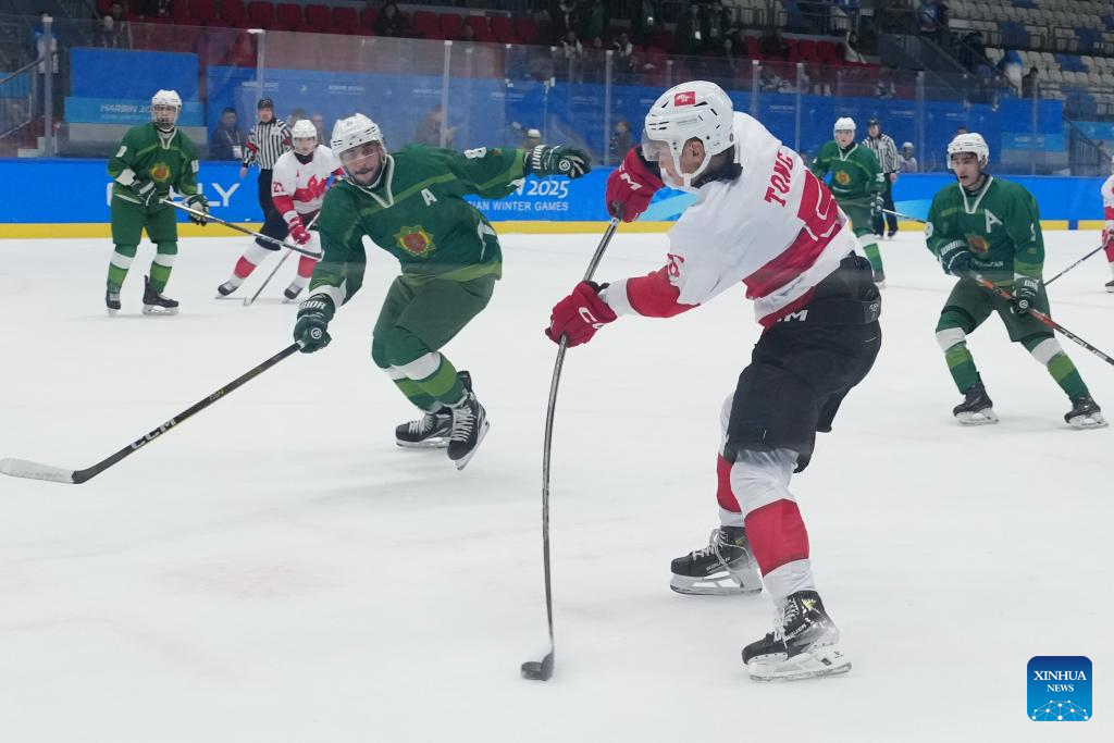 Tong Maxwell Wai Hin (C) of China's Hong Kong passes during the men's ice hockey group C match between Turkmenistan and China's Hong Kong at 2025 Asian Winter Games in Harbin, northeast China's Heilongjiang Province, on Feb. 9, 2025. (Xinhua/Zheng Huansong)