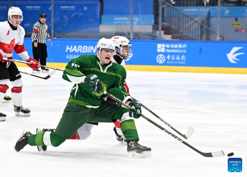 Dovrangeldi Bayjayev (1st R) of Turkmenistan competes during the men's ice hockey group C match between Turkmenistan and China's Hong Kong at 2025 Asian Winter Games in Harbin, northeast China's Heilongjiang Province, on Feb. 9, 2025. (Xinhua/Li Ziheng)