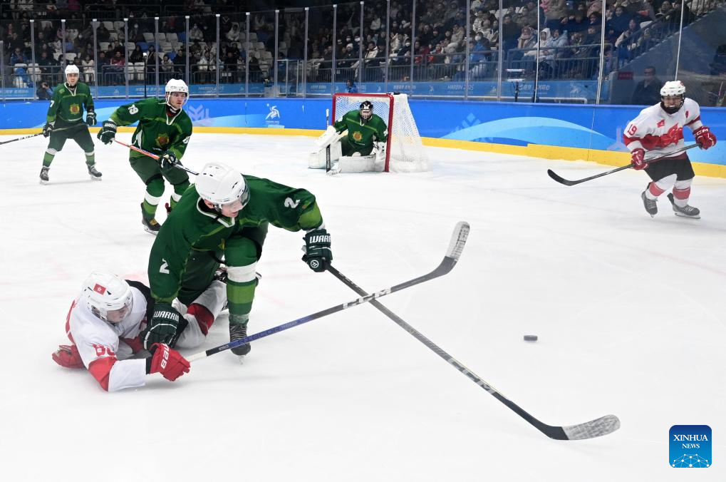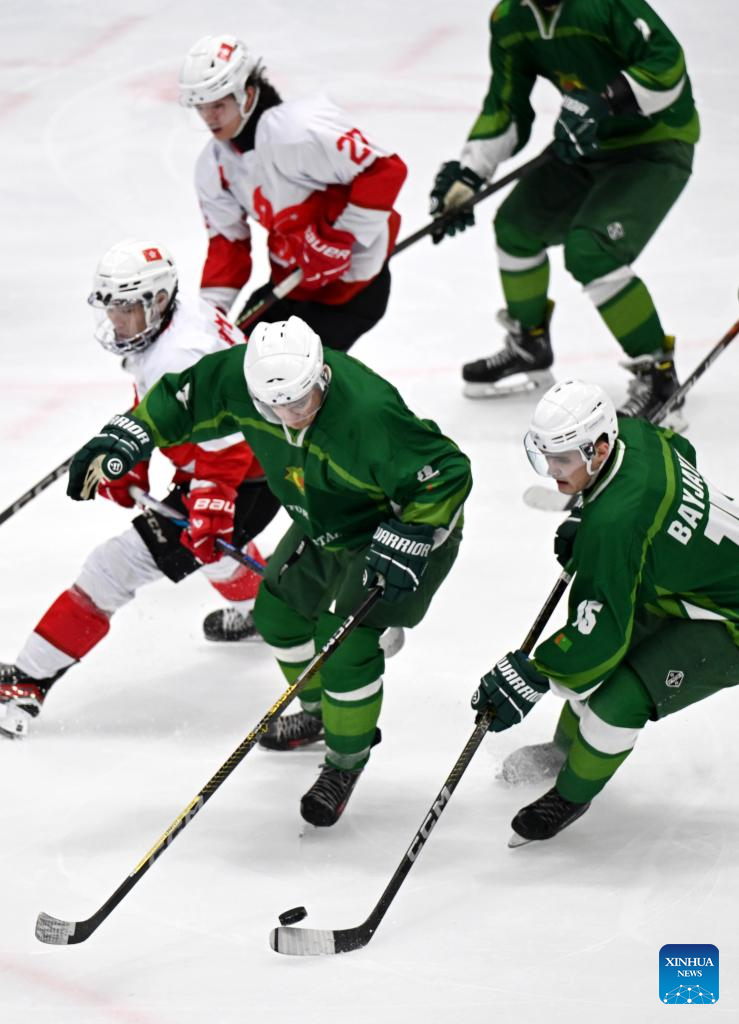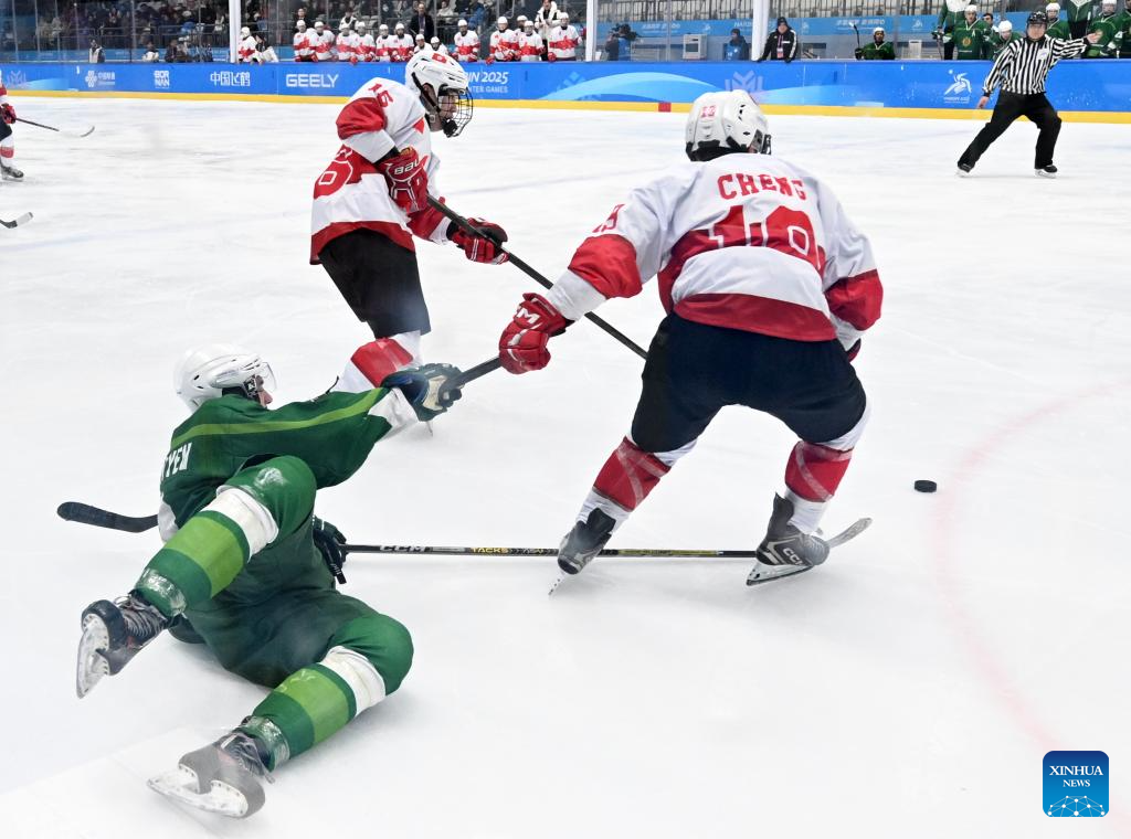 Wang Tsan Lam (C) of China's Hong Kong competes during the men's ice hockey group C match between Turkmenistan and China's Hong Kong at 2025 Asian Winter Games in Harbin, northeast China's Heilongjiang Province, on Feb. 9, 2025. (Xinhua/Zheng Huansong)