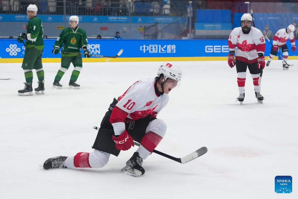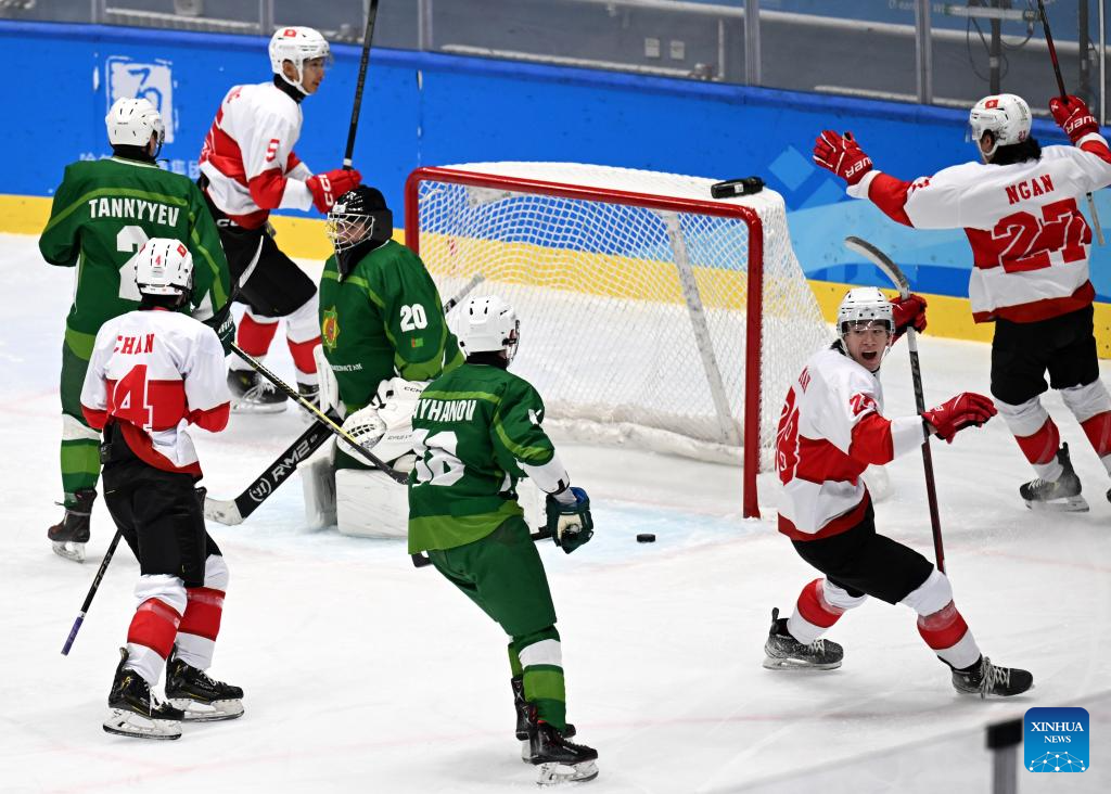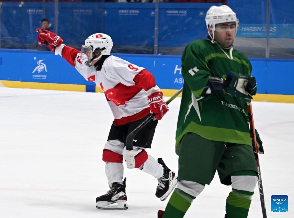 Tang Bryan of China's Hong Kong celebrates scoring during the men's ice hockey group C match between Turkmenistan and China's Hong Kong at 2025 Asian Winter Games in Harbin, northeast China's Heilongjiang Province, on Feb. 9, 2025. (Xinhua/Zheng Huansong)