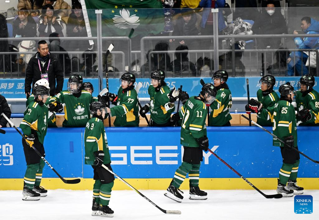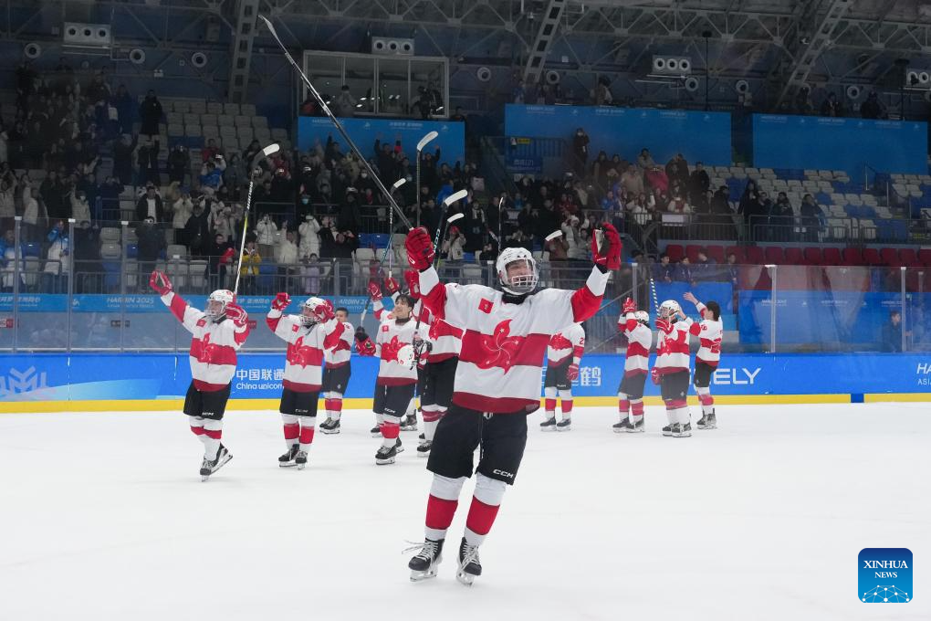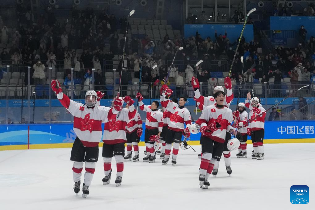 Team members of China's Hong Kong celebrate during the men's ice hockey group C match between Turkmenistan and China's Hong Kong at 2025 Asian Winter Games in Harbin, northeast China's Heilongjiang Province, on Feb. 9, 2025. (Xinhua/Li Ziheng)