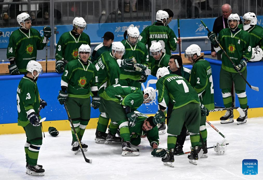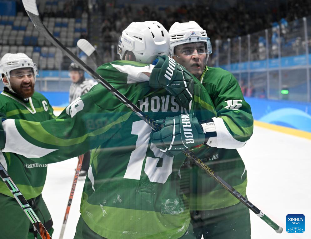 Dovrangeldi Bayjayev (R) and Aleksandr Vahovskiy (C) of Turkmenistan celebrate during the men's ice hockey group C match between Turkmenistan and China's Hong Kong at 2025 Asian Winter Games in Harbin, northeast China's Heilongjiang Province, on Feb. 9, 2025. (Xinhua/Li Jianan)