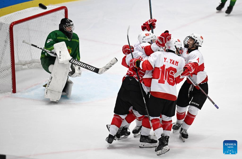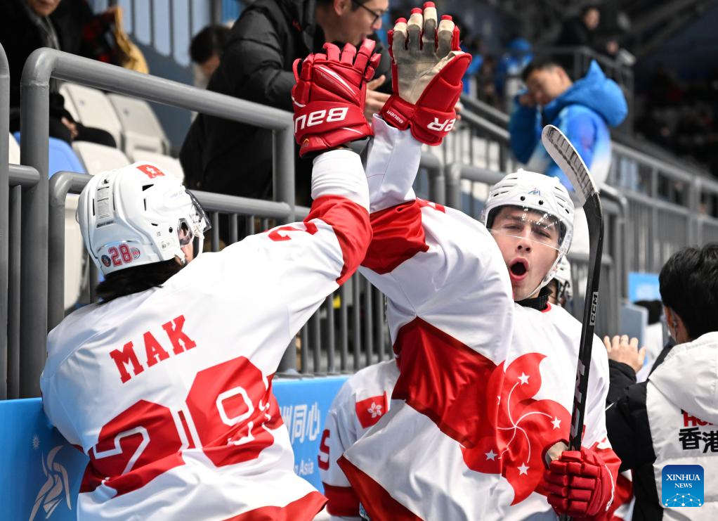 Chu Ryan Chak Hay (L) of China's Hong Kong celebrate during the men's ice hockey group C match between Turkmenistan and China's Hong Kong at 2025 Asian Winter Games in Harbin, northeast China's Heilongjiang Province, on Feb. 9, 2025. (Xinhua/Li Jianan)