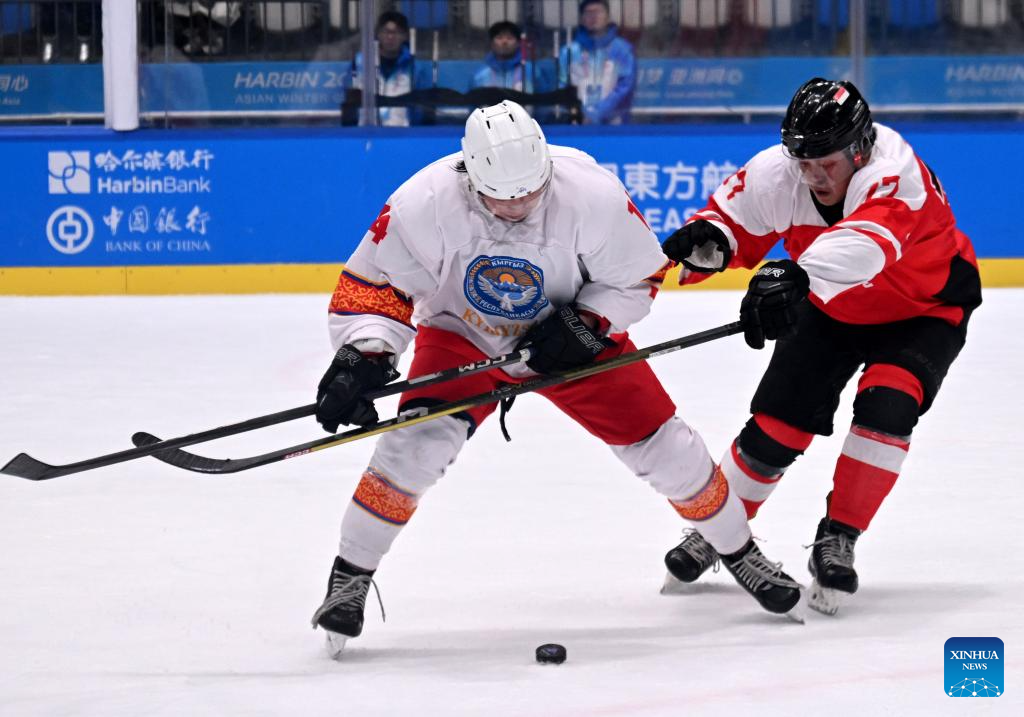 Elmer Colby Ruben (1st R) of China's Hong Kong and Bayhanov Novruz of Turkmenistan compete during the men's ice hockey group C match between Turkmenistan and China's Hong Kong at 2025 Asian Winter Games in Harbin, northeast China's Heilongjiang Province, on Feb. 9, 2025. (Xinhua/Li Ziheng)