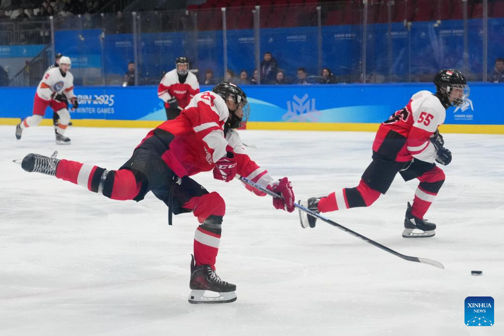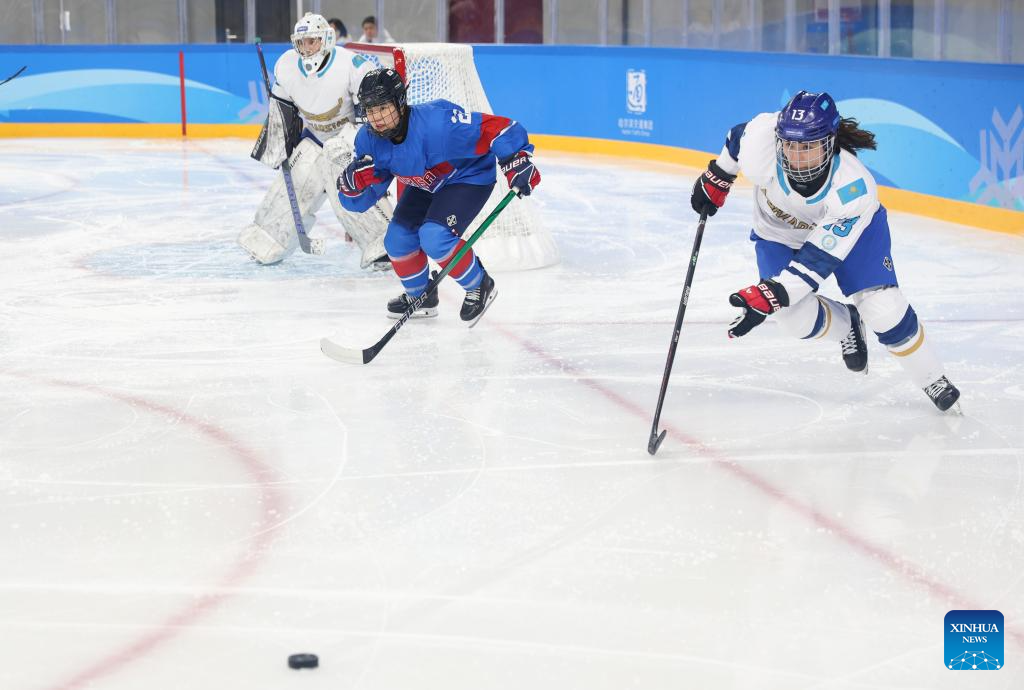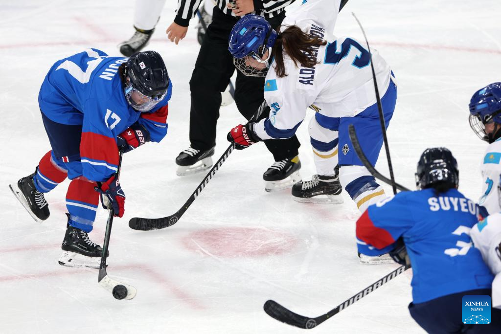 Madina Tursynova (R) of Kazakhstan competes during the women's ice hockey group B match between Kazakhstan and South Korea at 2025 Asian Winter Games in Harbin, northeast China's Heilongjiang Province, on Feb. 9, 2025. (Xinhua/Lyu Shuai)