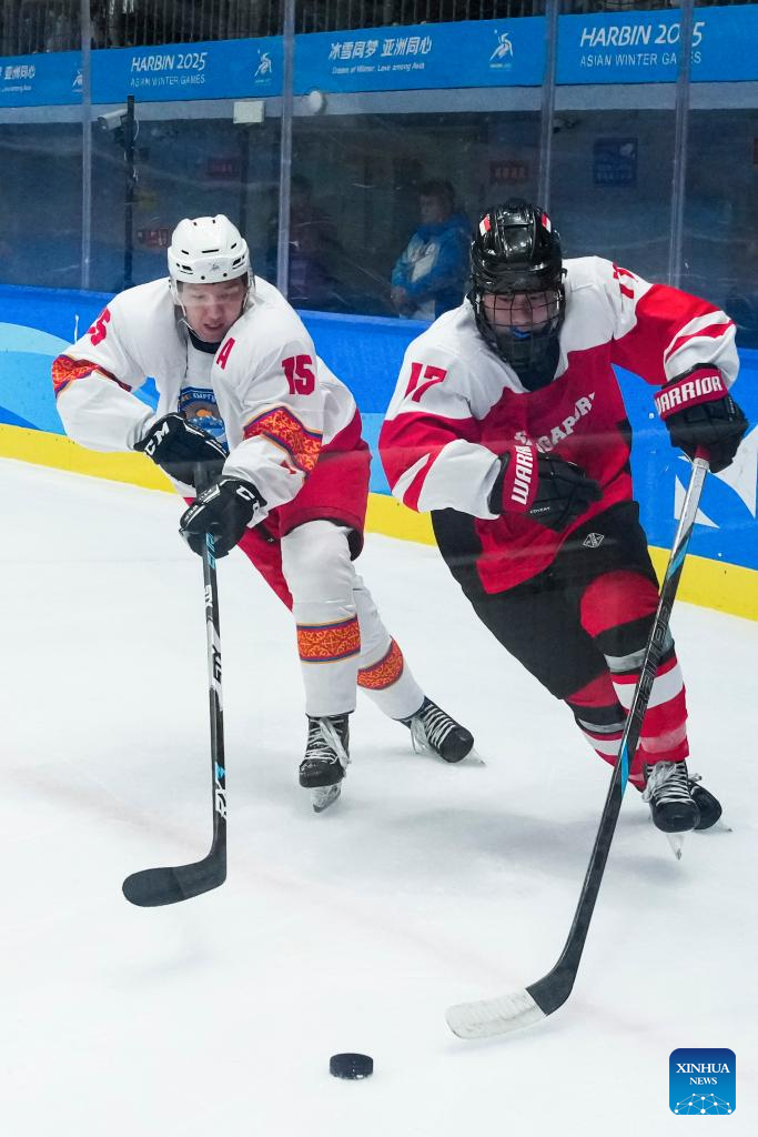 Islambek Abdyraev of Kyrgyzstan (L) vies with Qian Yong Jia Benedict of Singapore during the men's ice hockey group B match between Kyrgyzstan and Singapore at 2025 Asian Winter Games in Harbin, northeast China's Heilongjiang Province, on Feb. 9, 2025. (Xinhua/Zheng Huansong)