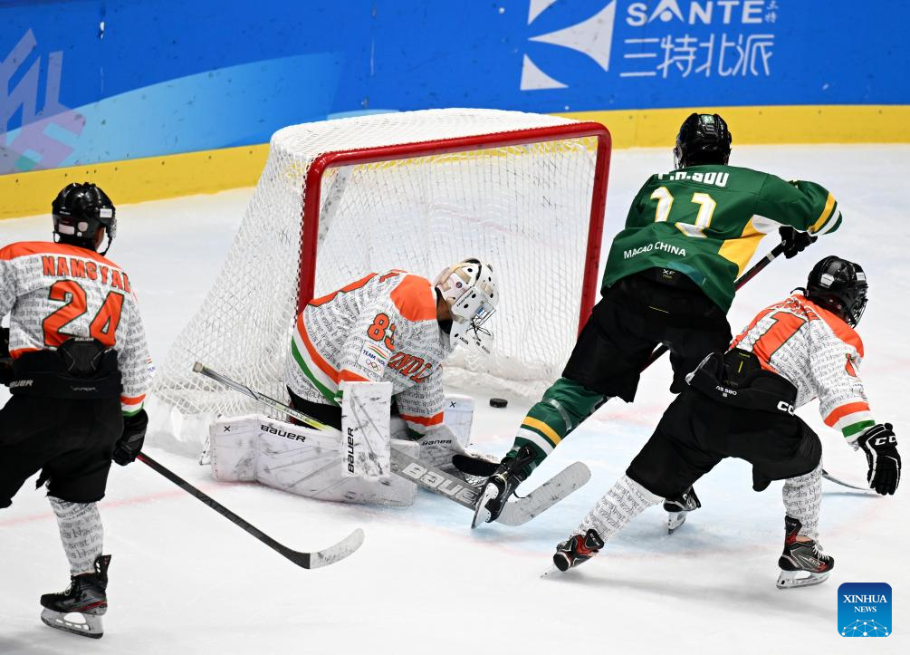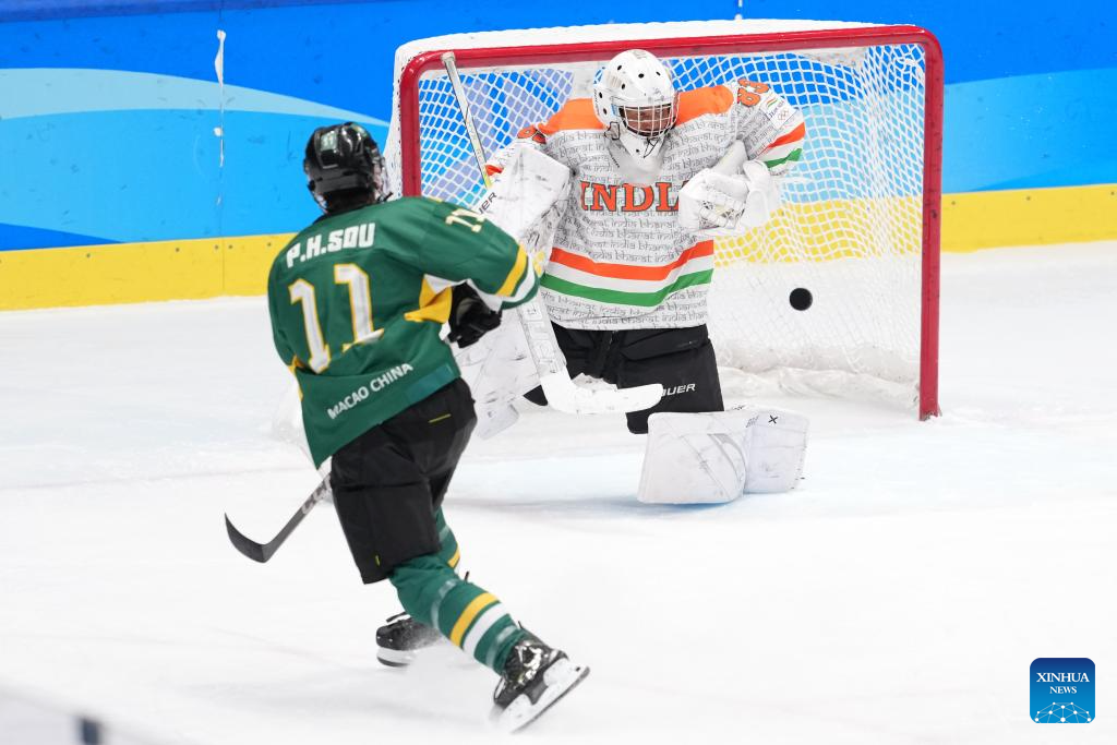 Sou Edison Pak Hei (L) of China's Macao shoots during the men's ice hockey group C match between India and China's Macao at 2025 Asian Winter Games in Harbin, northeast China's Heilongjiang Province, on Feb. 9, 2025. (Xinhua/Zheng Huansong)