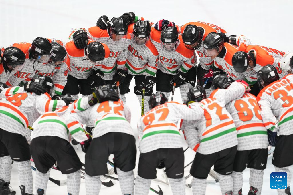 Players of India cheer before the men's ice hockey group C match between India and China's Macao at 2025 Asian Winter Games in Harbin, northeast China's Heilongjiang Province, on Feb. 9, 2025. (Xinhua/Zheng Huansong)