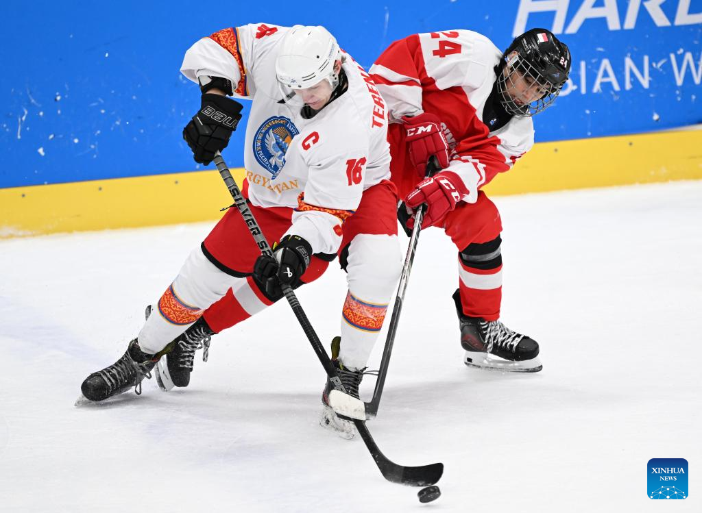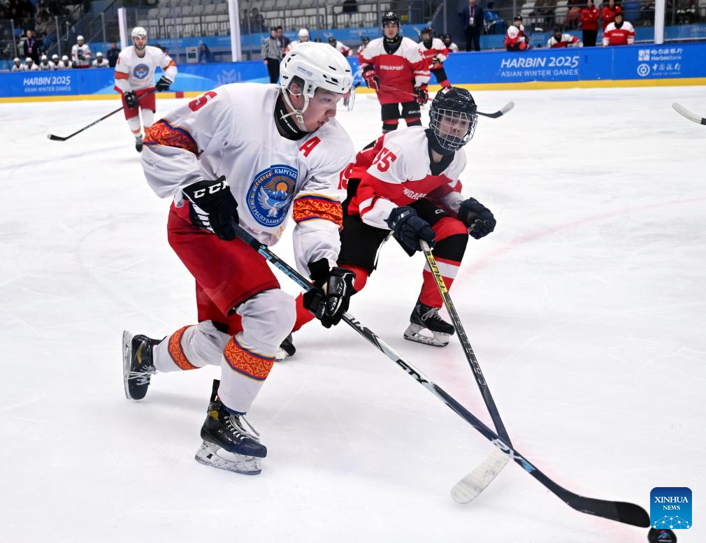 Islambek Abdyraev (front) of Kyrgyzstan competes during the men's ice hockey group B match between Kyrgyzstan and Singapore at 2025 Asian Winter Games in Harbin, northeast China's Heilongjiang Province, on Feb. 9, 2025. (Xinhua/Li Ziheng)