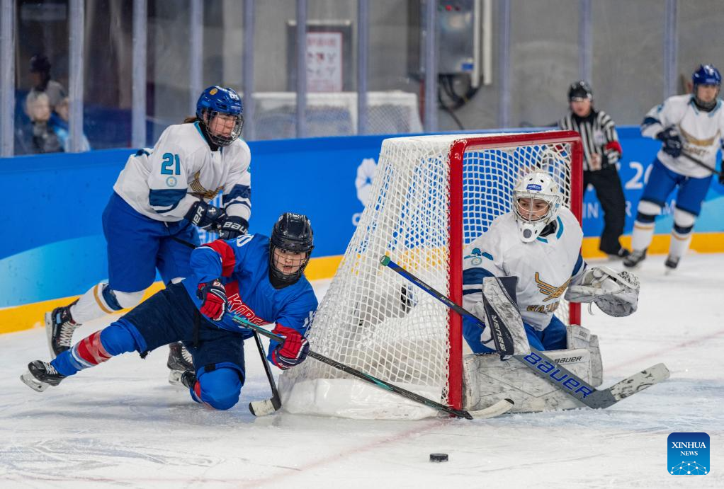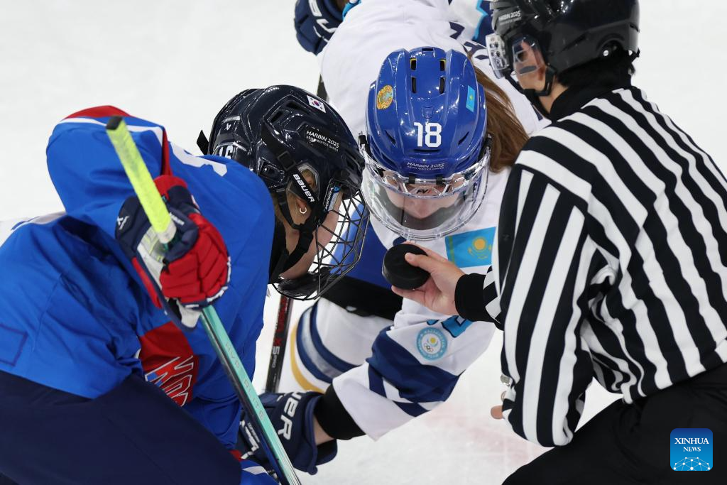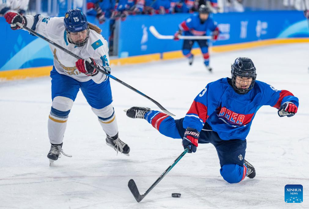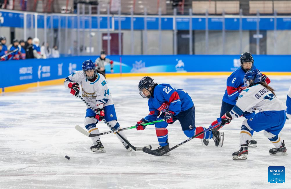 Choi Jiyeon (2nd L) of South Korea vies with Yuliya Butorina (1st L) of Kazakhstan during the women's ice hockey group B match between Kazakhstan and South Korea at 2025 Asian Winter Games in Harbin, northeast China's Heilongjiang Province, on Feb. 9, 2025. (Xinhua/Sun Fei)