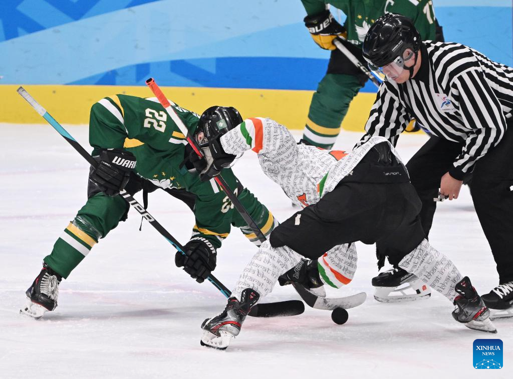 Players of both sides compete during the men's ice hockey group C match between India and China's Macao at 2025 Asian Winter Games in Harbin, northeast China's Heilongjiang Province, on Feb. 9, 2025. (Xinhua/Zheng Huansong)