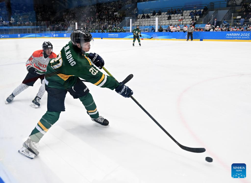 Sou Edison Pak Hei (2nd R) shoots during the men's ice hockey group C match between India and China's Macao at 2025 Asian Winter Games in Harbin, northeast China's Heilongjiang Province, on Feb. 9, 2025. (Xinhua/Li Ziheng)