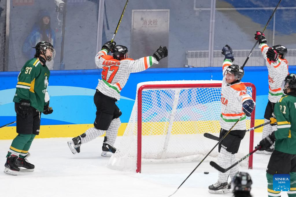 Players of China's Macao celebrate scoring during the men's ice hockey group C match between India and China's Macao at 2025 Asian Winter Games in Harbin, northeast China's Heilongjiang Province, on Feb. 9, 2025. (Xinhua/Li Ziheng)