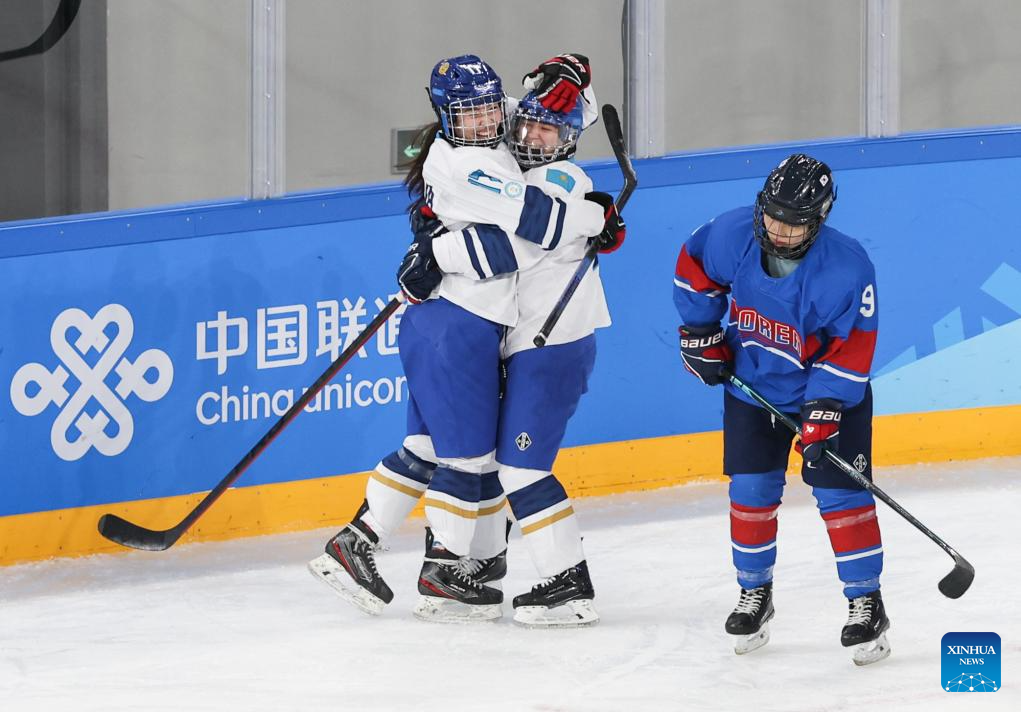 Alexandra Shegay (C) of Kazakhstan celebrates scoring with teammate during the women's ice hockey group B match between Kazakhstan and South Korea at 2025 Asian Winter Games in Harbin, northeast China's Heilongjiang Province, on Feb. 9, 2025. (Xinhua/Lyu Shuai)