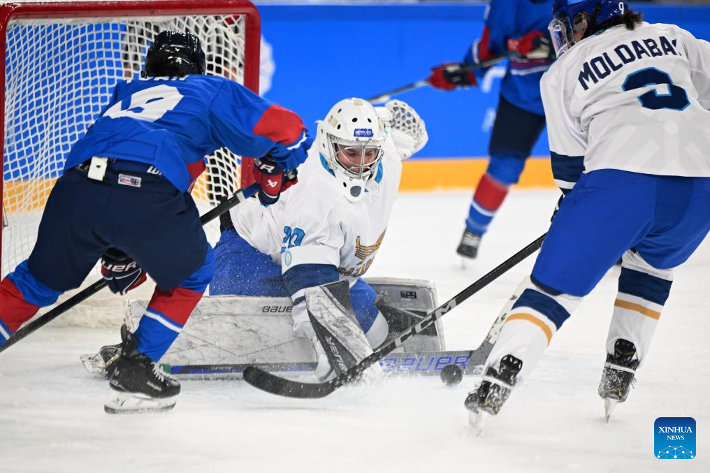 Goalkeeper Arina Chshyokolova (C) of Kazakhstan makes a save during the women's ice hockey group B match between Kazakhstan and South Korea at 2025 Asian Winter Games in Harbin, northeast China's Heilongjiang Province, on Feb. 9, 2025. (Xinhua/Chen Bin)