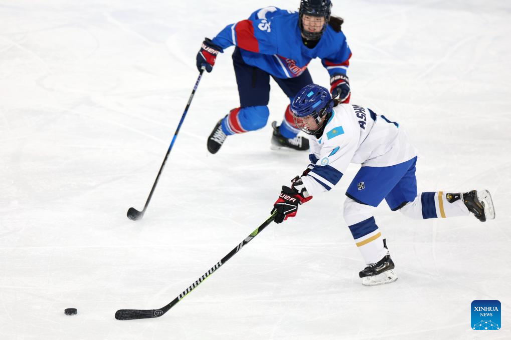 Pernesh Ashimova (R) of Kazakhstan competes during the women's ice hockey group B match between Kazakhstan and South Korea at 2025 Asian Winter Games in Harbin, northeast China's Heilongjiang Province, on Feb. 9, 2025. (Xinhua/Chen Bin)