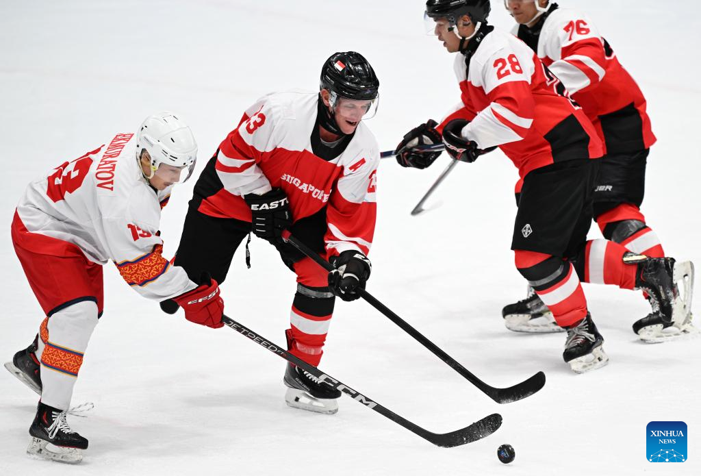Bekmuratov Adil (front L) of Kyrgyzstan vies with James Nicholas Kodrowski (front R) of Singapore during the men's ice hockey group B match between Kyrgyzstan and Singapore at 2025 Asian Winter Games in Harbin, northeast China's Heilongjiang Province, on Feb. 9, 2025. (Xinhua/Li Jianan)