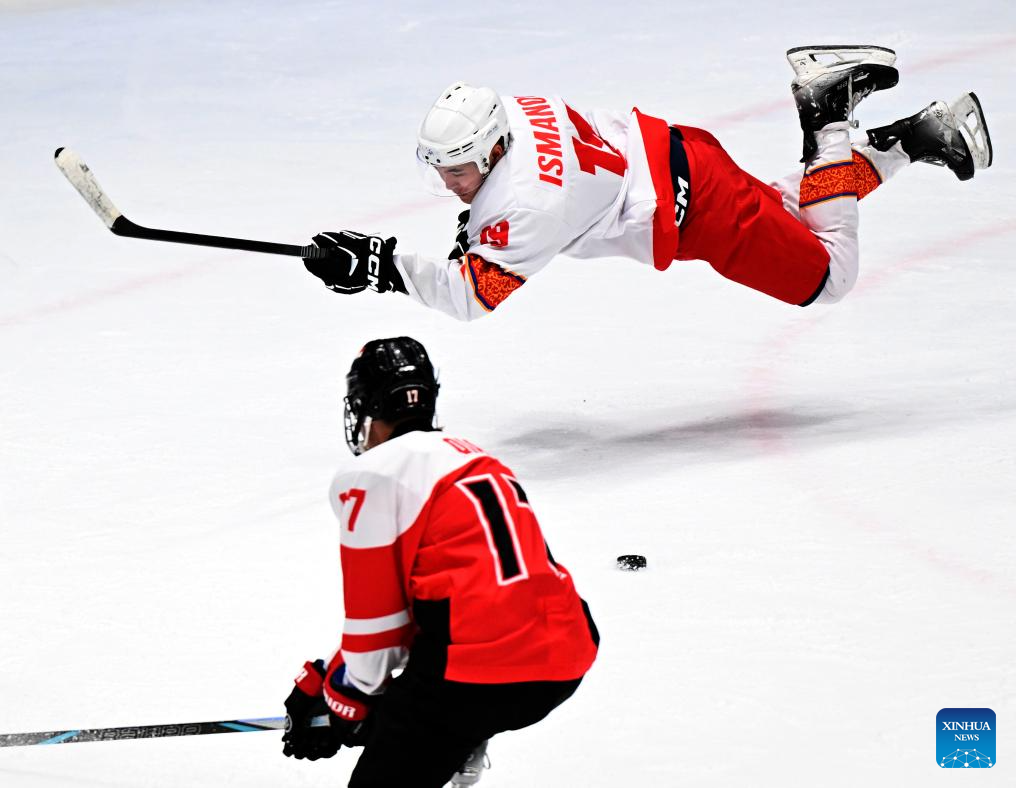 Sultan Ismanov (top) of Kyrgyzstan competes during the men's ice hockey group B match between Kyrgyzstan and Singapore at 2025 Asian Winter Games in Harbin, northeast China's Heilongjiang Province, on Feb. 9, 2025. (Xinhua/Li Jianan)