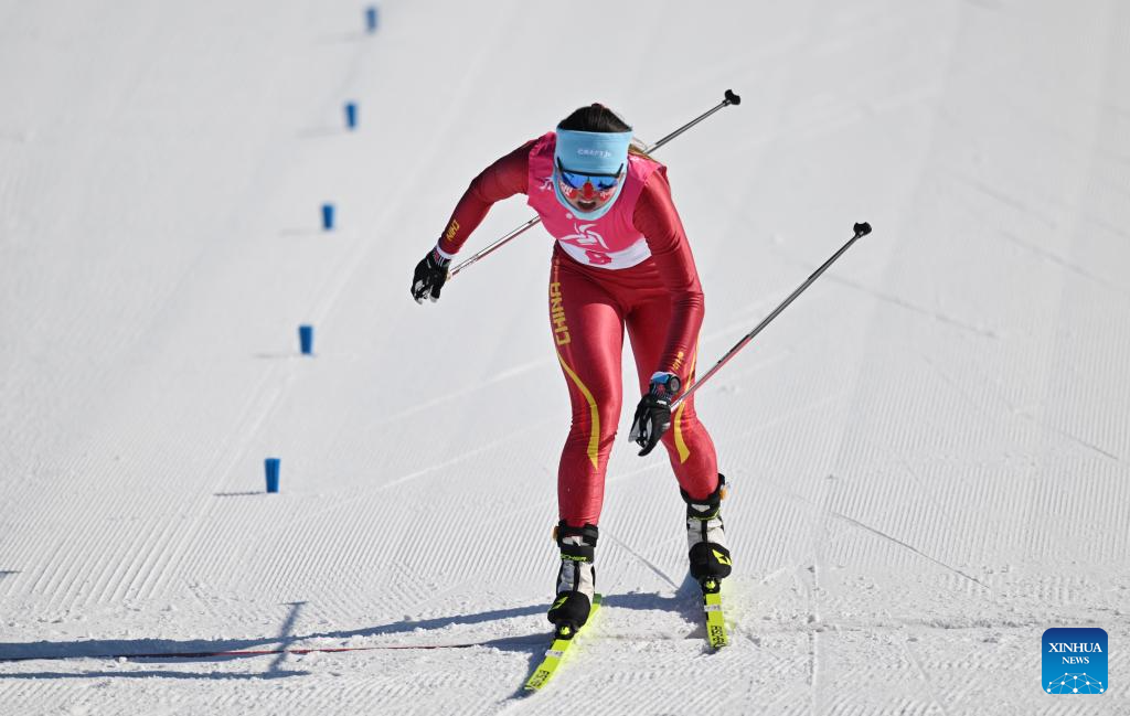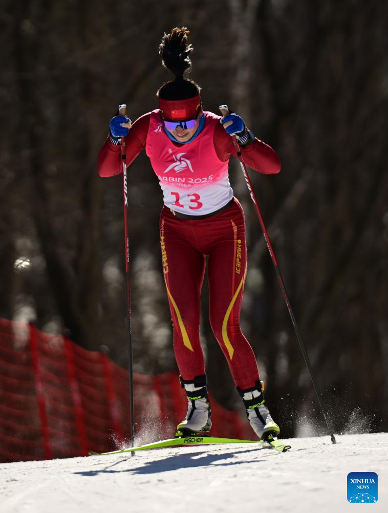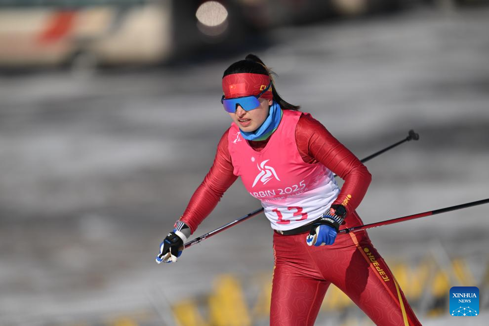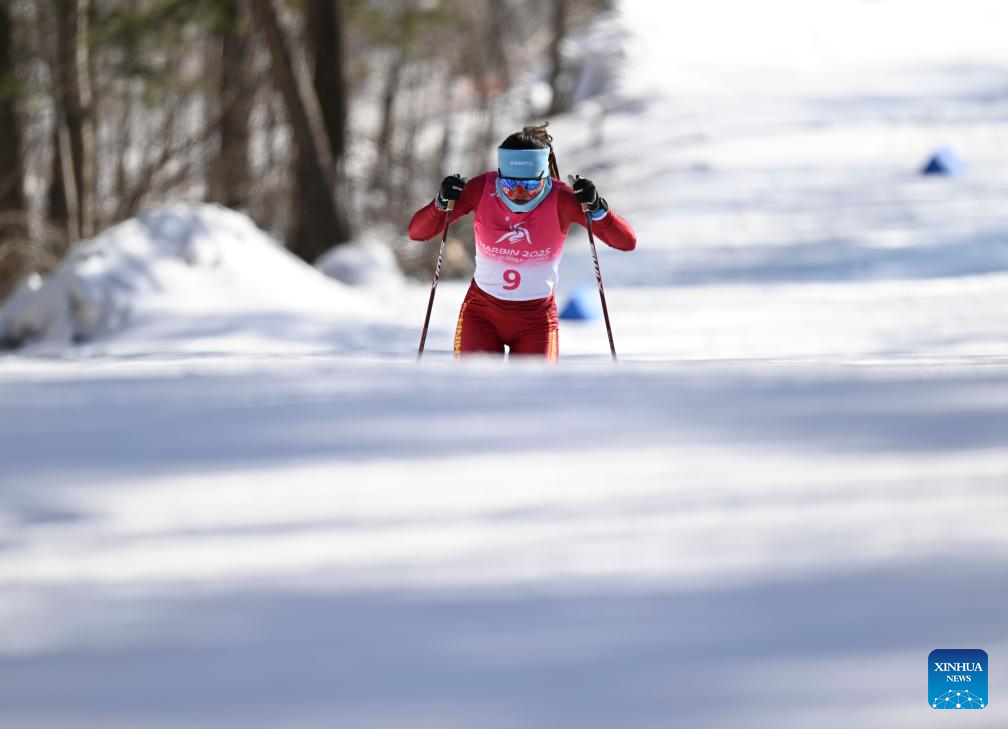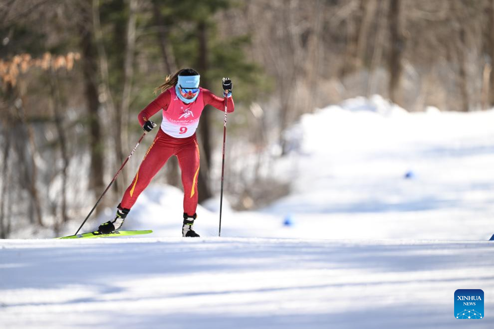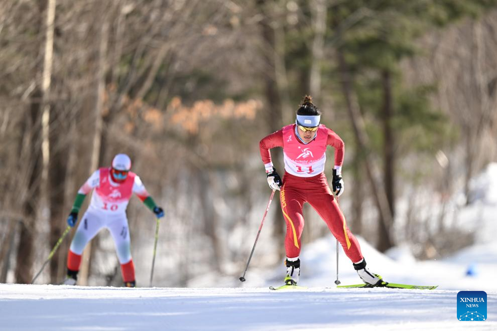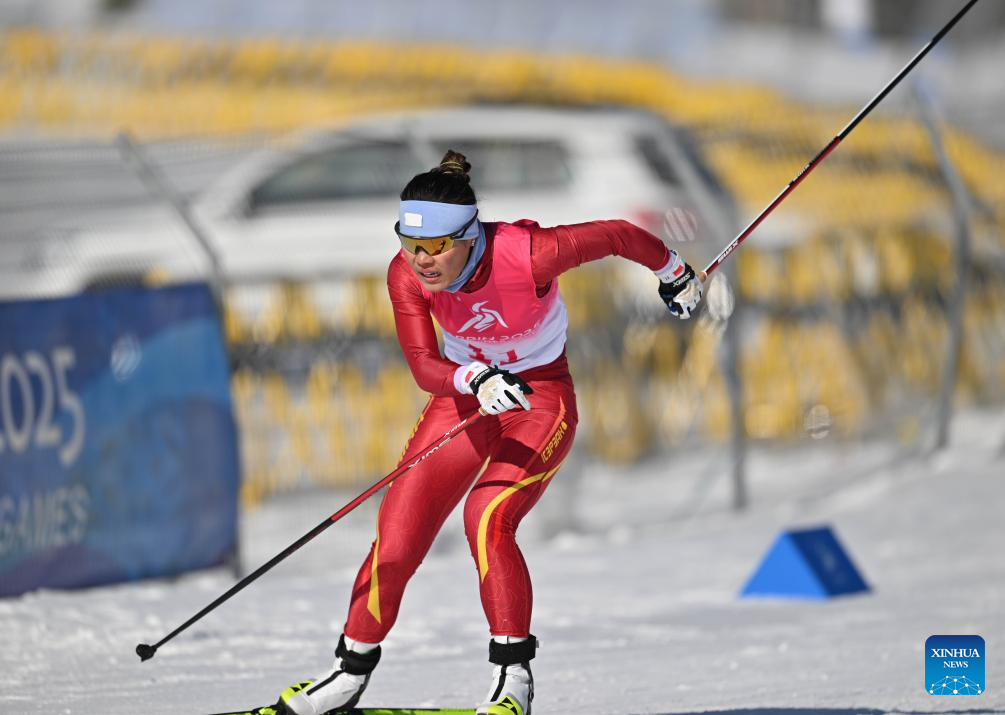 Bayani Jialin of China competes during the Cross-Country Skiing women's 5km free match at the 9th Asian Winter Games in Yabuli, northeast China's Heilongjiang Province, Feb. 9, 2025. (Xinhua/Zhang Long)