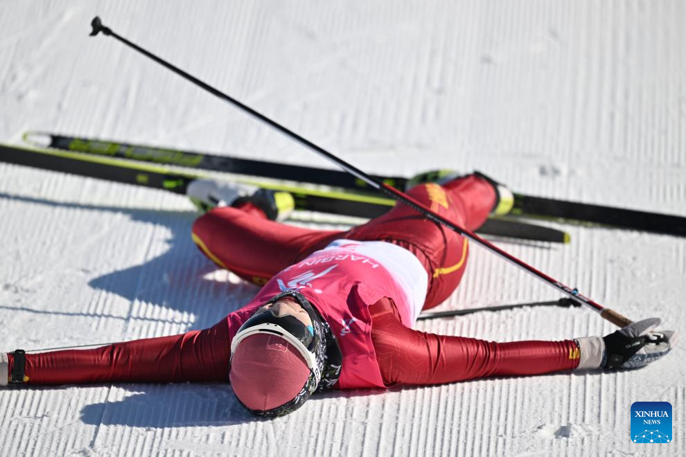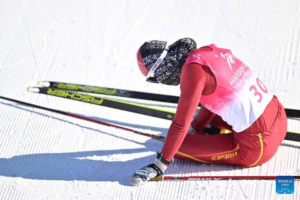 Chi Chunxue of China reacts after the Cross-Country Skiing women's 5km free match at the 9th Asian Winter Games in Yabuli, northeast China's Heilongjiang Province, Feb. 9, 2025. (Xinhua/Wu Zhizun)