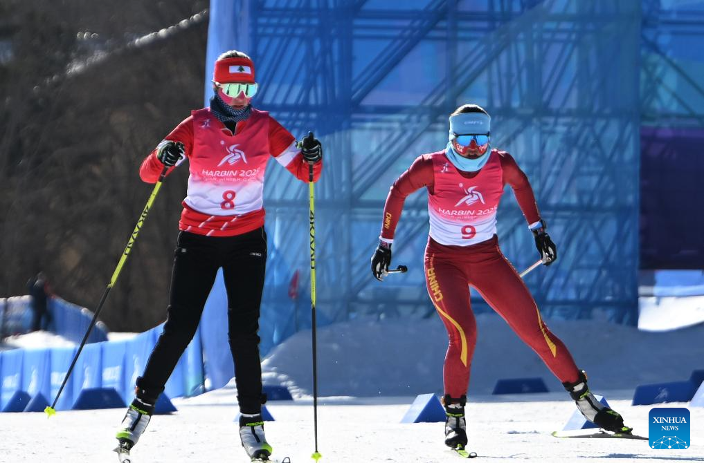 Bayani Jialin (R) of China competes during the Cross-Country Skiing women's 5km free match at the 9th Asian Winter Games in Yabuli, northeast China's Heilongjiang Province, Feb. 9, 2025. (Xinhua/Wu Zhizun)