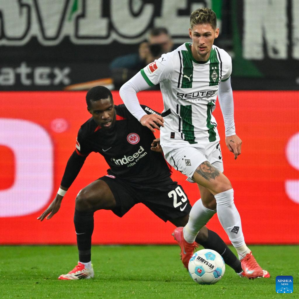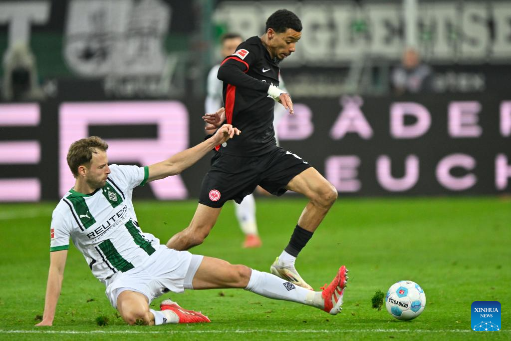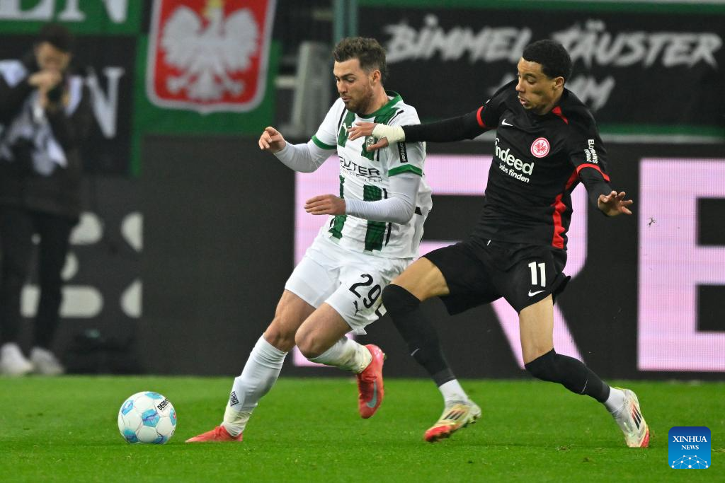 Tomas Cvancara (R) of Borussia Moenchengladbach vies with Niels Nkounkou of Eintracht Frankfurt during the first division of Bundesliga football match between Borussia Moenchengladbach and Eintracht Frankfurt in Moenchengladbach, Germany, Feb. 8, 2025. (Photo by Ulrich Hufnagel/Xinhua)