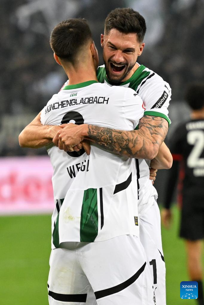 Tim Kleindienst (R) of Borussia Moenchengladbach celebrates scoring during the first division of Bundesliga football match between Borussia Moenchengladbach and Eintracht Frankfurt in Moenchengladbach, Germany, Feb. 8, 2025. (Photo by Ulrich Hufnagel/Xinhua)