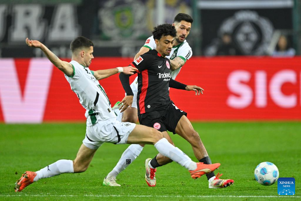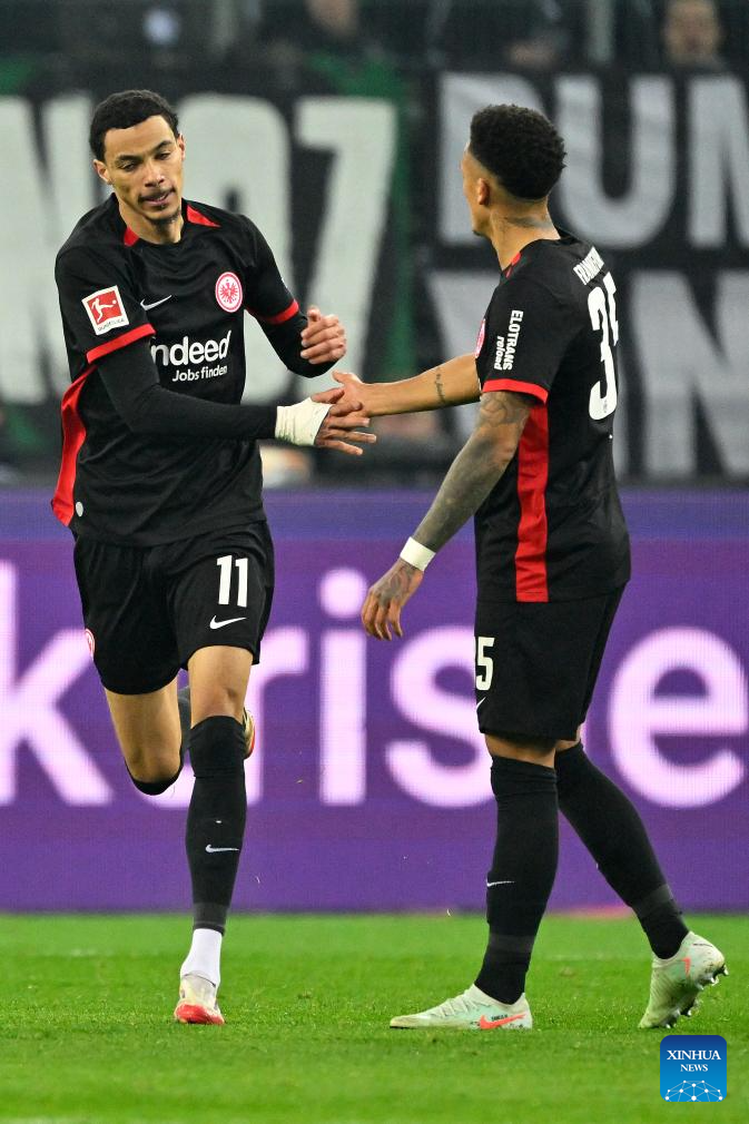 Hugo Ekitike (L) of Eintracht Frankfurt celebrates scoring during the first division of Bundesliga football match between Borussia Moenchengladbach and Eintracht Frankfurt in Moenchengladbach, Germany, Feb. 8, 2025. (Photo by Ulrich Hufnagel/Xinhua)