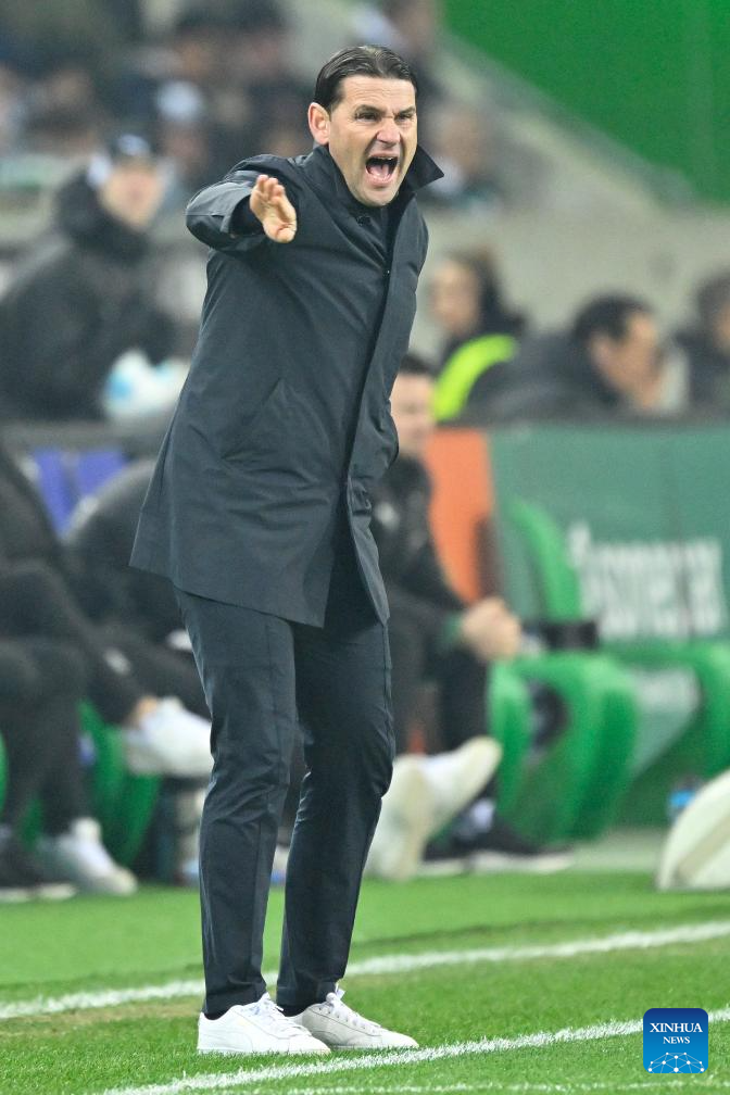 Gerardo Seoane, head coach of Borussia Moenchengladbach, instructs during the first division of Bundesliga football match between Borussia Moenchengladbach and Eintracht Frankfurt in Moenchengladbach, Germany, Feb. 8, 2025. (Photo by Ulrich Hufnagel/Xinhua)