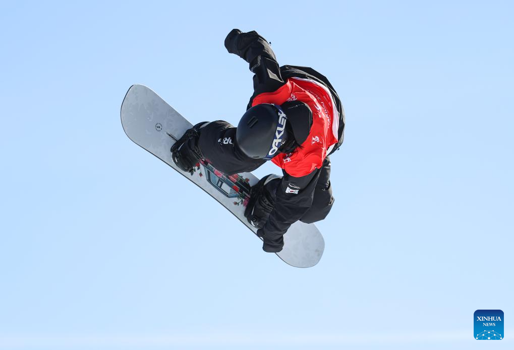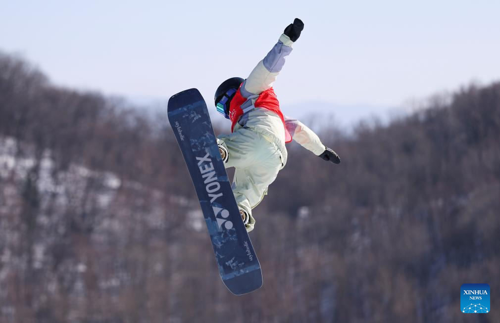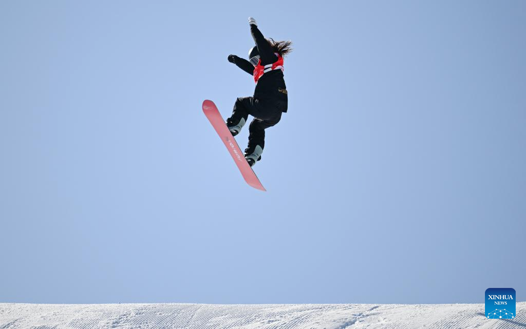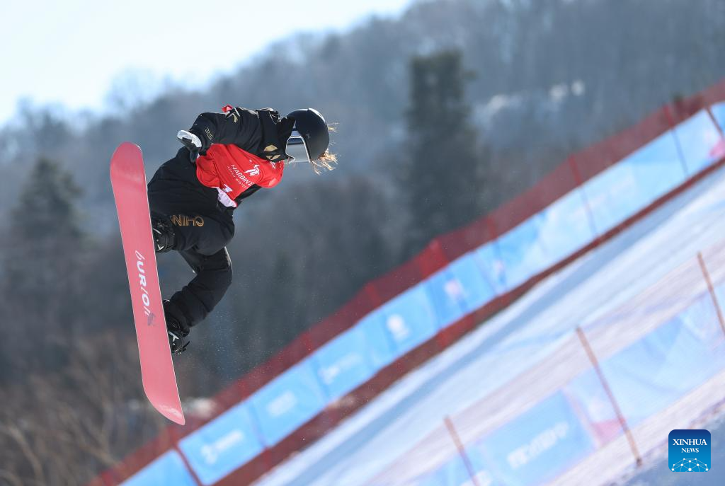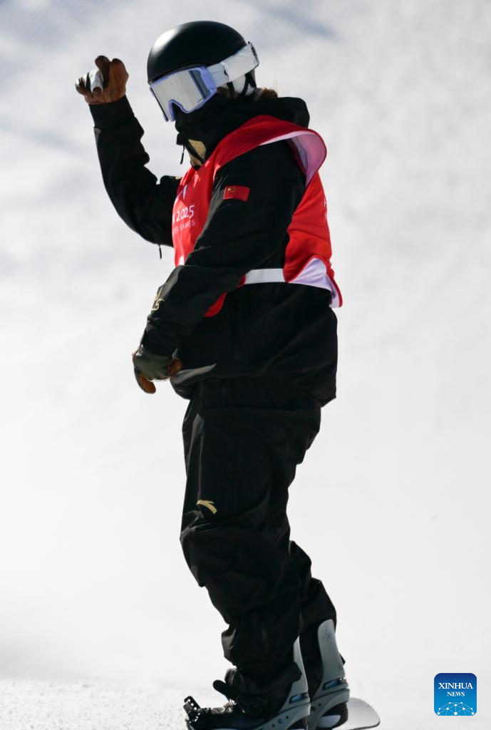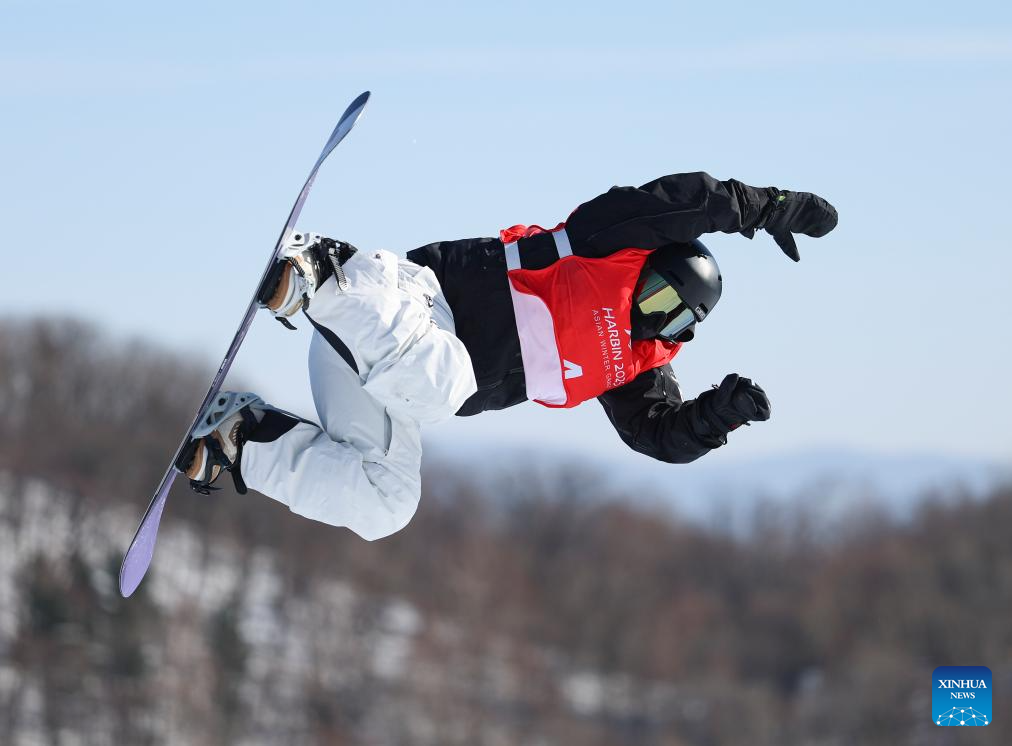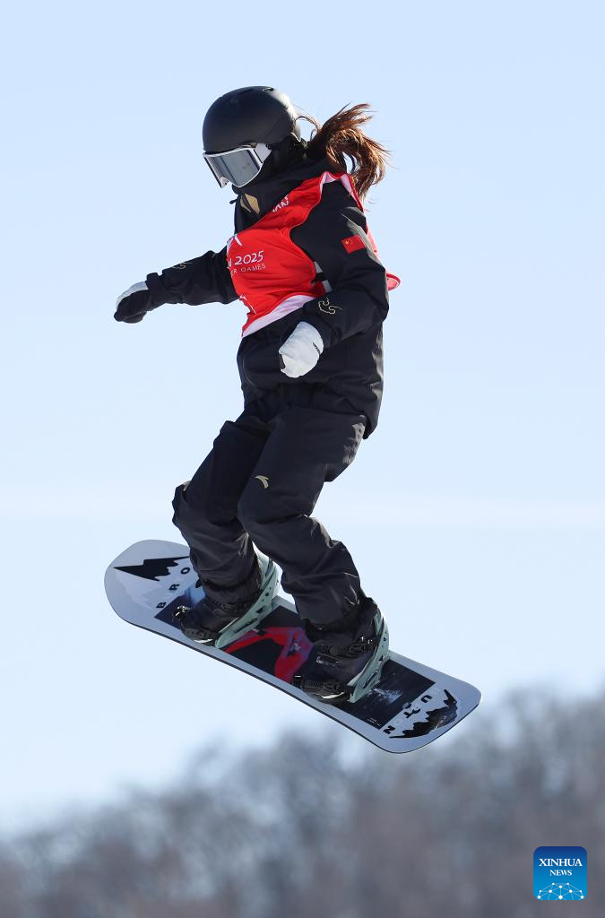 Xiong Shirui of China competes during the women's snowboard big air final match at the 9th Asian Winter Games in Yabuli, northeast China's Heilongjiang Province, Feb. 10, 2025. (Xinhua/Mu Yu)