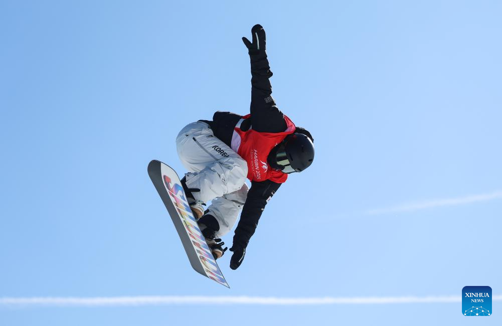 Yu Seungeun of South Korea competes during the women's snowboard big air final match at the 9th Asian Winter Games in Yabuli, northeast China's Heilongjiang Province, Feb. 10, 2025. (Xinhua/Yang Qing)