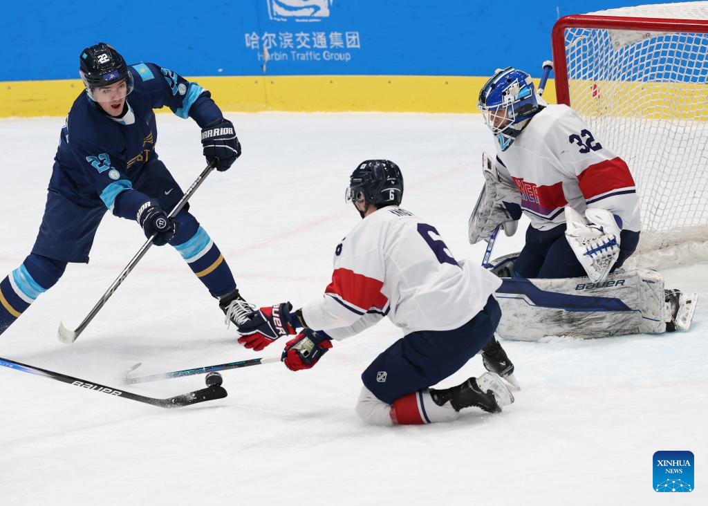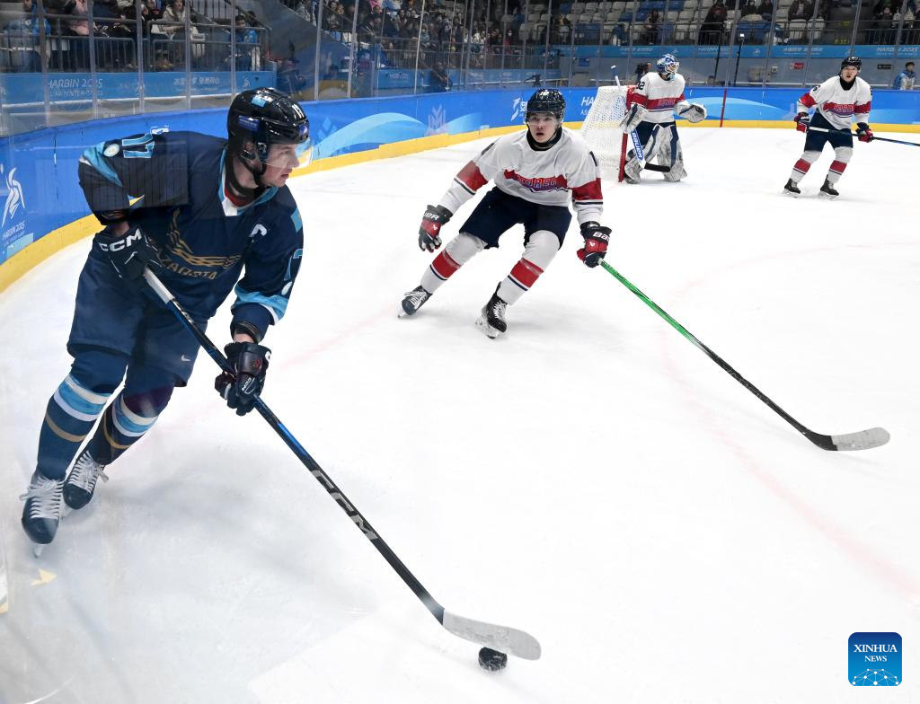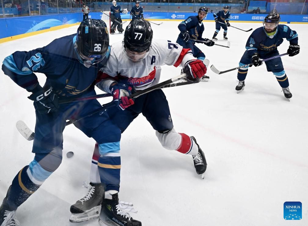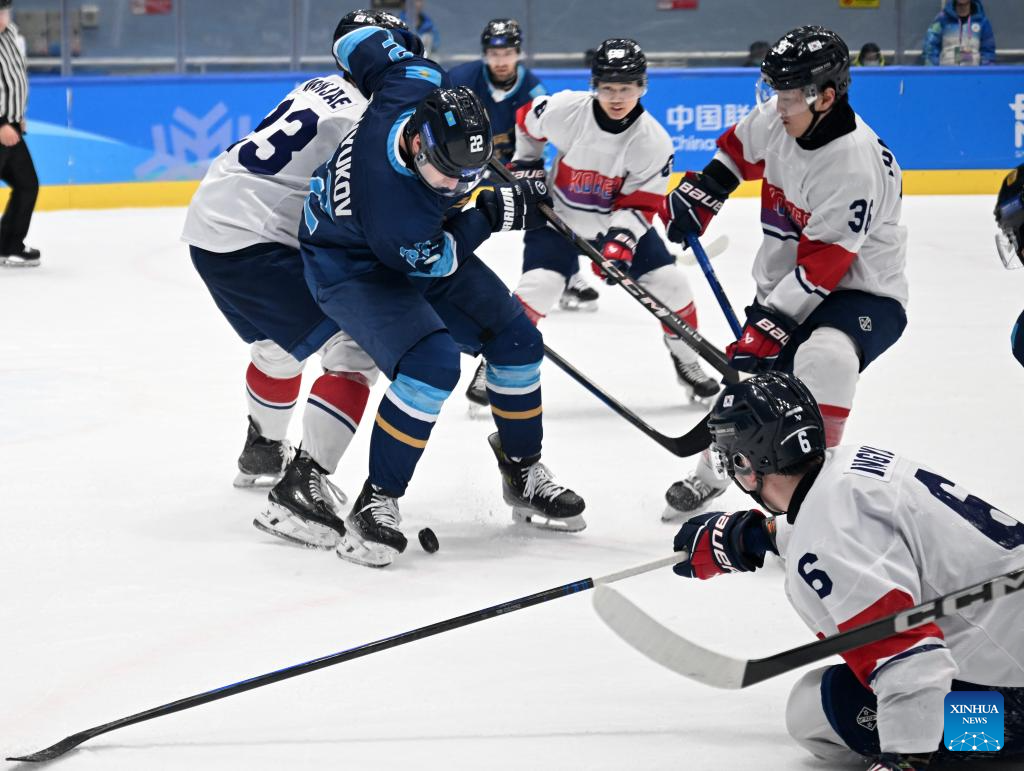 Kirill Panyukov (2nd L) of Kazakhstan competes during the men's Ice Hockey group A match between Kazakhstan and South Korea at the 9th Asian Winter Games in Harbin, northeast China's Heilongjiang Province, on Feb. 10, 2025. (Xinhua/Li Jianan)