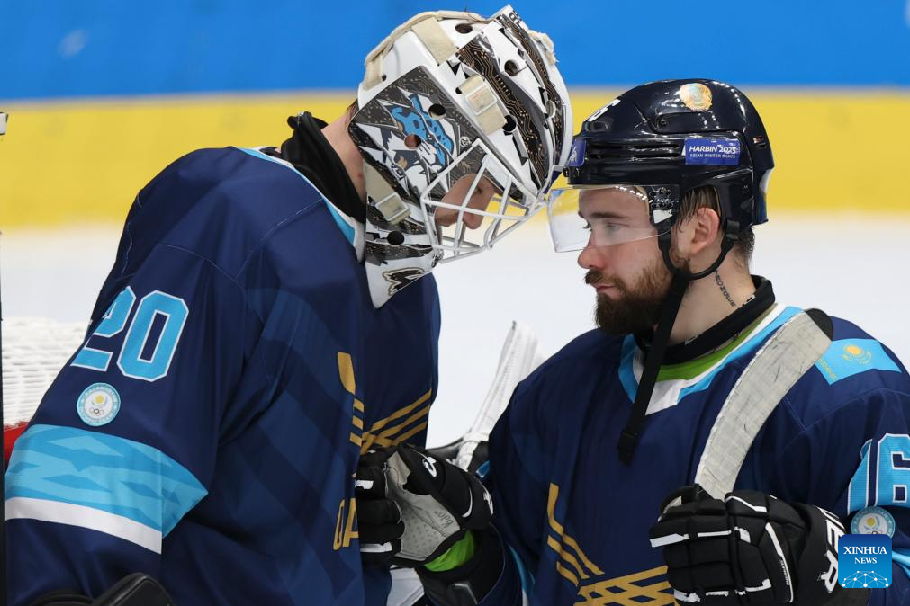 Andrey Shutov (L) and Alexandr Borissevich of Kazakhstan celebrate winning after the men's Ice Hockey group A match between Kazakhstan and South Korea at the 9th Asian Winter Games in Harbin, northeast China's Heilongjiang Province, on Feb. 10, 2025. (Xinhua/Zhang Tao)