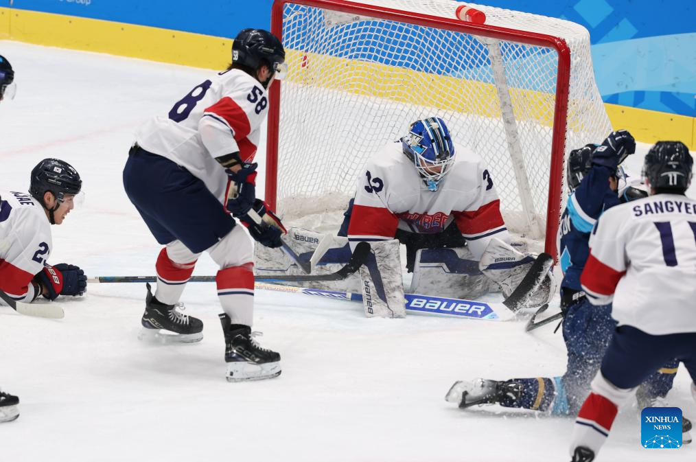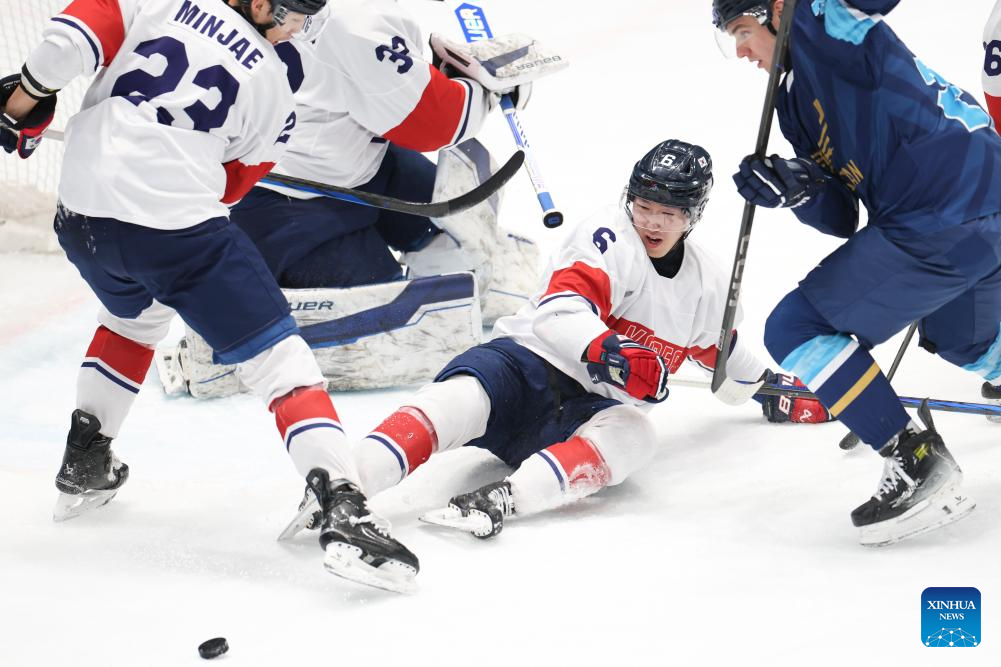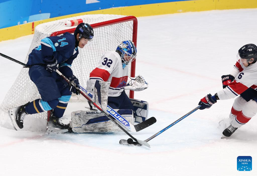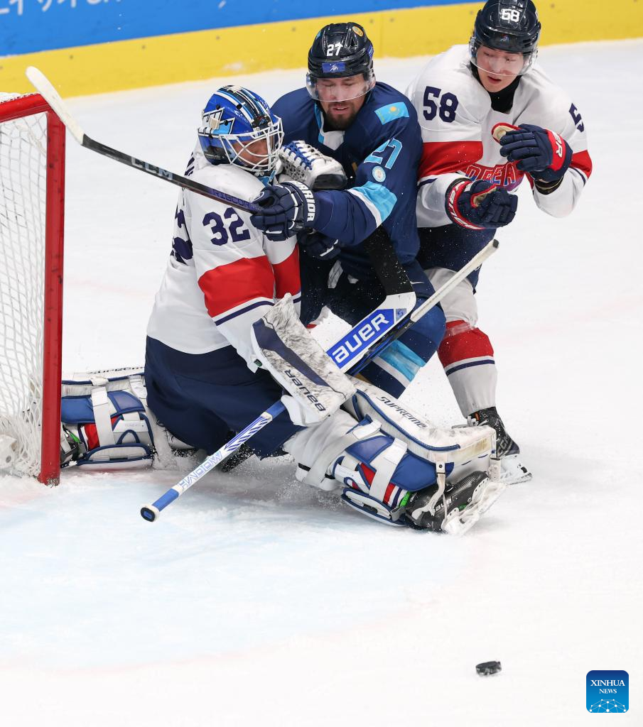 Lee Yeonseung (C) of South Korea defenses during the men's Ice Hockey group A match between Kazakhstan and South Korea at the 9th Asian Winter Games in Harbin, northeast China's Heilongjiang Province, on Feb. 10, 2025. (Xinhua/Yang Lei)