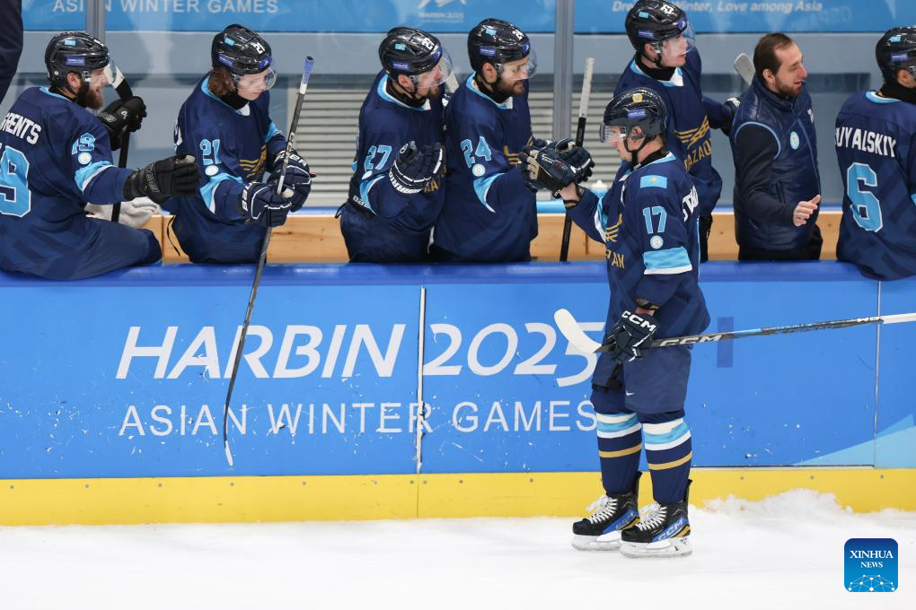 Roman Starchenko (front) of Kazakhstan celebrates scoring during the men's Ice Hockey group A match between Kazakhstan and South Korea at the 9th Asian Winter Games in Harbin, northeast China's Heilongjiang Province, on Feb. 10, 2025. (Xinhua/Zhang Tao)