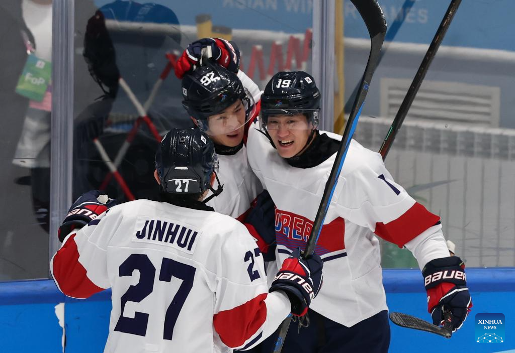 Kang Yoon Seok (C) of South Korea celebrates scoring with teammates Ahn Jinhui (L) and Kim Sangwook during the men's Ice Hockey group A match between Kazakhstan and South Korea at the 9th Asian Winter Games in Harbin, northeast China's Heilongjiang Province, on Feb. 10, 2025. (Xinhua/Yang Lei)