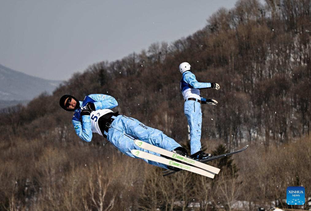Assylkhan Assan/Dinmukhammed Raimkulov (R) of Kazakhstan compete during the Freestyle Skiing men's aerials synchro final at the 9th Asian Winter Games in Yabuli, northeast China's Heilongjiang Province, Feb. 11, 2025. (Xinhua/Xia Yifang)
