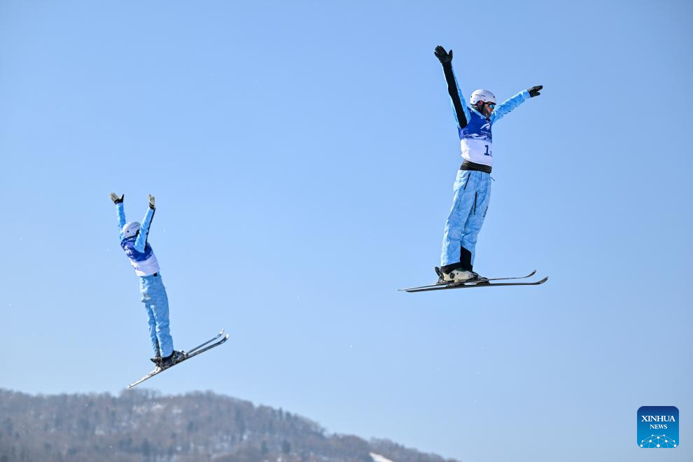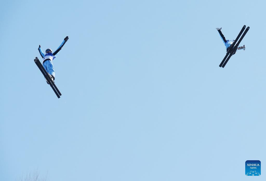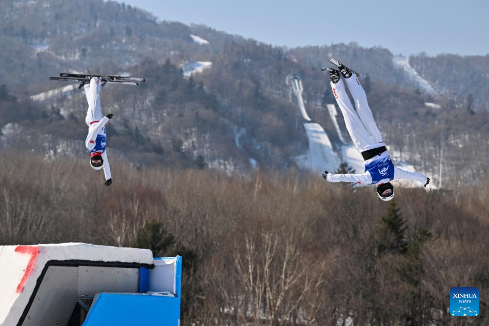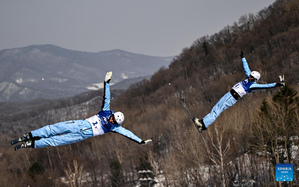 Geng Hu (R)/Yang Yuheng of China compete during the Freestyle Skiing men's aerials synchro final at the 9th Asian Winter Games in Yabuli, northeast China's Heilongjiang Province, Feb. 11, 2025. (Xinhua/Yang Chenguang)
