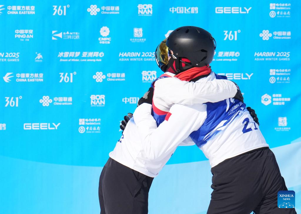 Qi Guangpu (L) of China hugs his teammate Li Xinpeng after the Freestyle Skiing men's aerials synchro final at the 9th Asian Winter Games in Yabuli, northeast China's Heilongjiang Province, Feb. 11, 2025. (Xinhua/Wang Song)