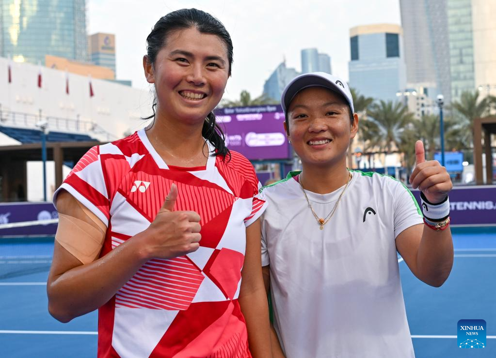 Jiang Xinyu (R) of China/Wu Fang-Hsien of Chinese Taipei pose for photos after women's doubles semi-final match between Jiang Xinyu of China/Wu Fang-Hsien of Chinese Taipei and Beatriz Haddad Maia of Brazil/Laura Siegemund of Germany at the WTA Qatar Open tennis tournament in Doha, Qatar, on Feb. 14, 2025. (Photo by Nikku/Xinhua)