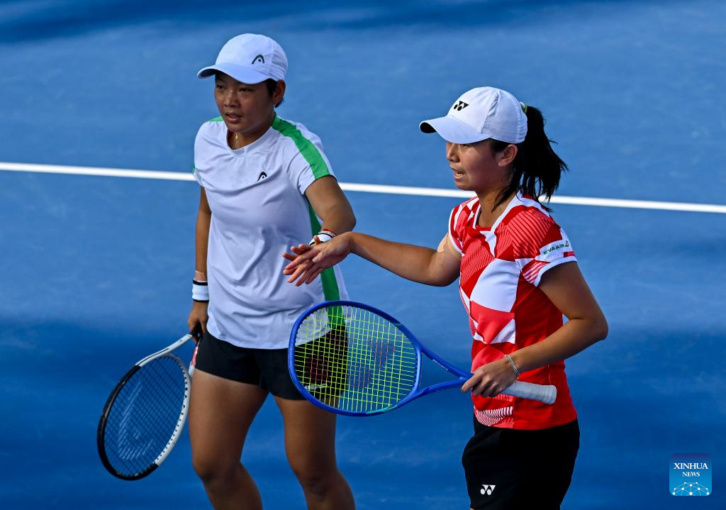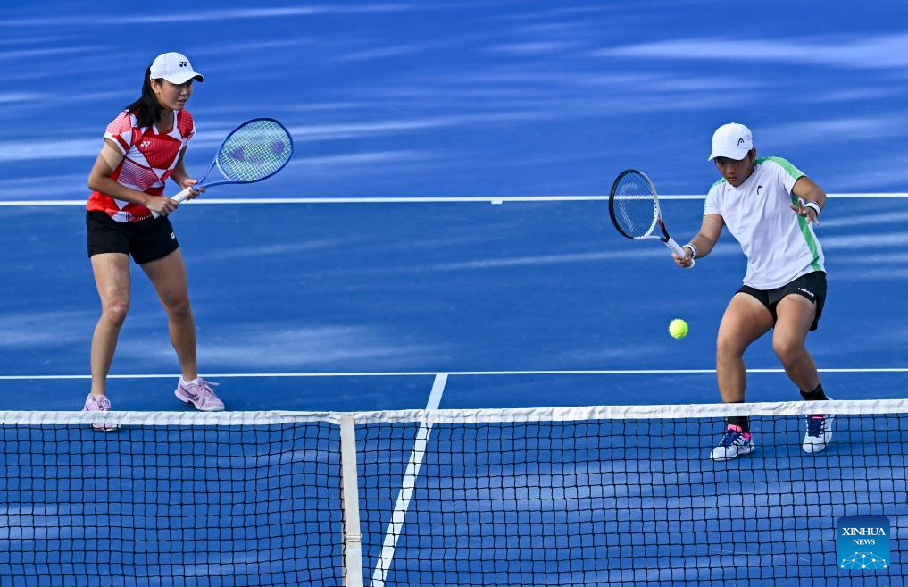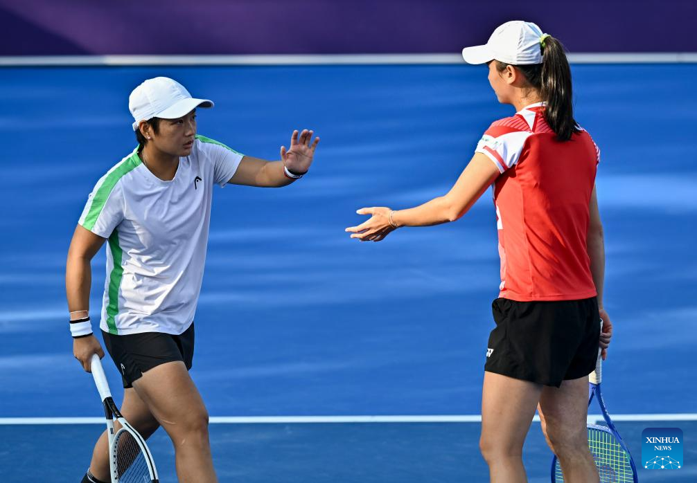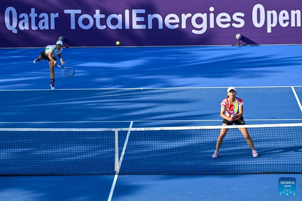 Jiang Xinyu (R) of China/Wu Fang-Hsien of Chinese Taipei compete during women's doubles semi-final match between Jiang Xinyu of China/Wu Fang-Hsien of Chinese Taipei and Beatriz Haddad Maia of Brazil/Laura Siegemund of Germany at the WTA Qatar Open tennis tournament in Doha, Qatar, on Feb. 14, 2025. (Photo by Nikku/Xinhua)