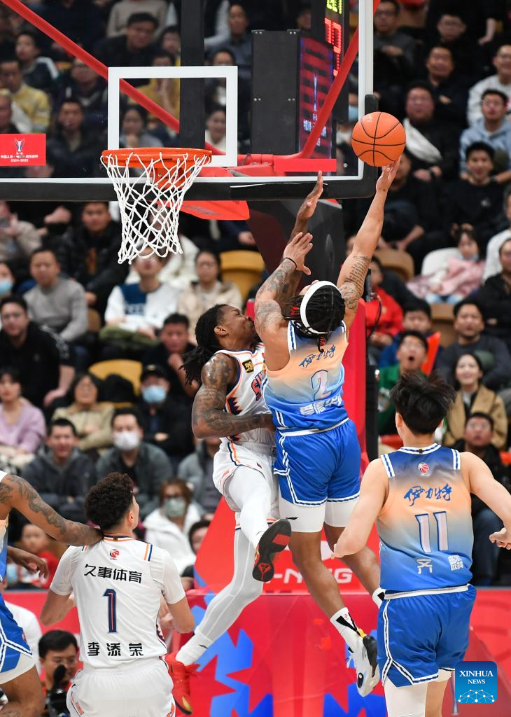 Kenneth Lofton Jr. (front) of Shanghai Sharks competes during the final match between Xinjiang Flying Tigers and Shanghai Sharks at the Chinese Basketball Association (CBA) Club Cup in Xi'an, northwest China's Shaanxi Province, Feb. 15, 2025. (Xinhua/Zhang Bowen)