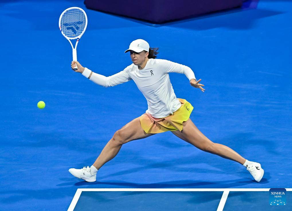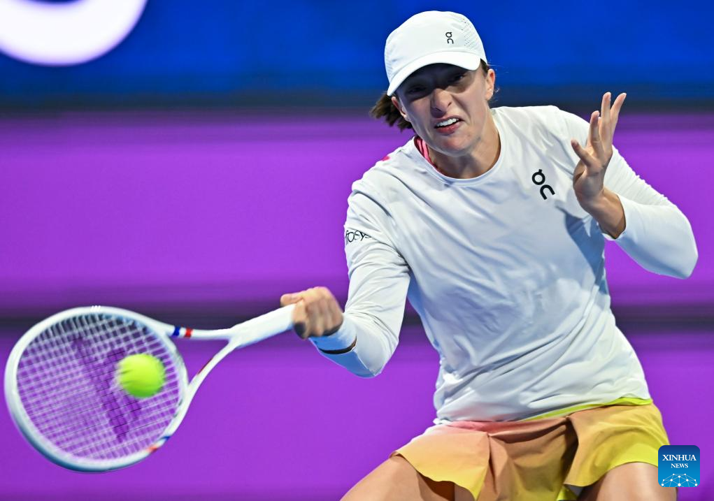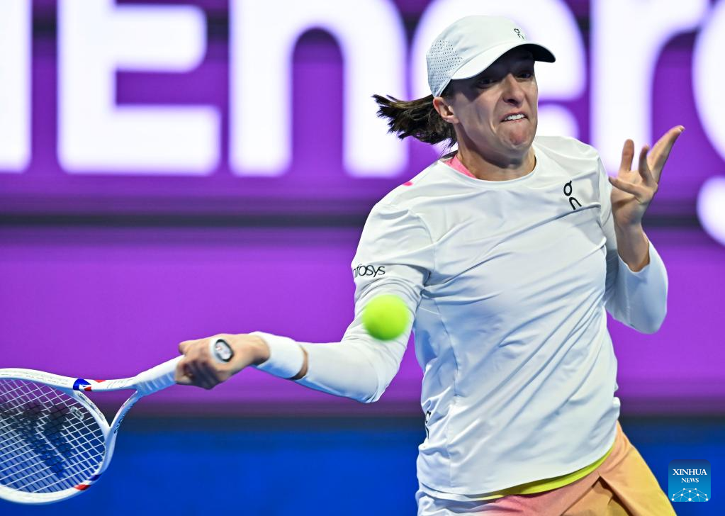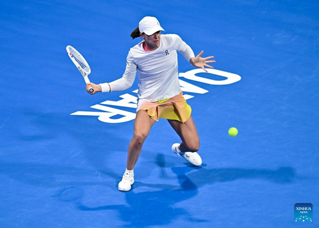 Iga Swiatek hits a return during the women's singles semi-final match between Iga Swiatek of Poland and Jelena Ostapenko of Latvia at the WTA Qatar Open tennis tournament in Doha, Qatar, on Feb. 14, 2025. (Photo by Nikku/Xinhua)