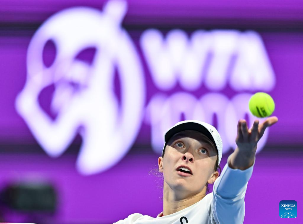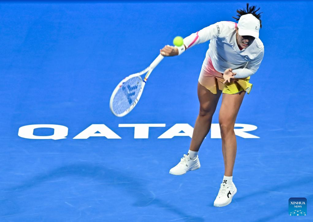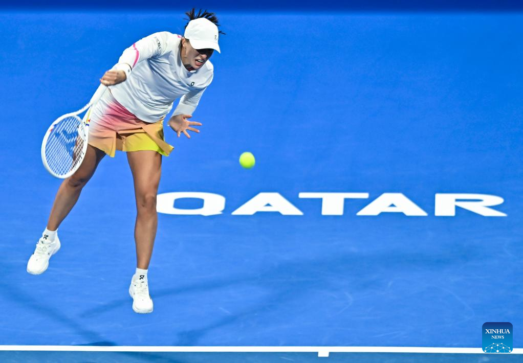 Iga Swiatek serves during the women's singles semi-final match between Iga Swiatek of Poland and Jelena Ostapenko of Latvia at the WTA Qatar Open tennis tournament in Doha, Qatar, on Feb. 14, 2025. (Photo by Nikku/Xinhua)