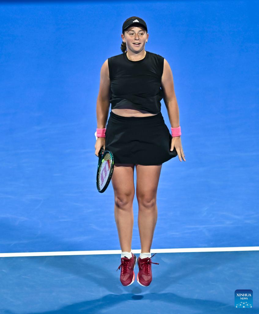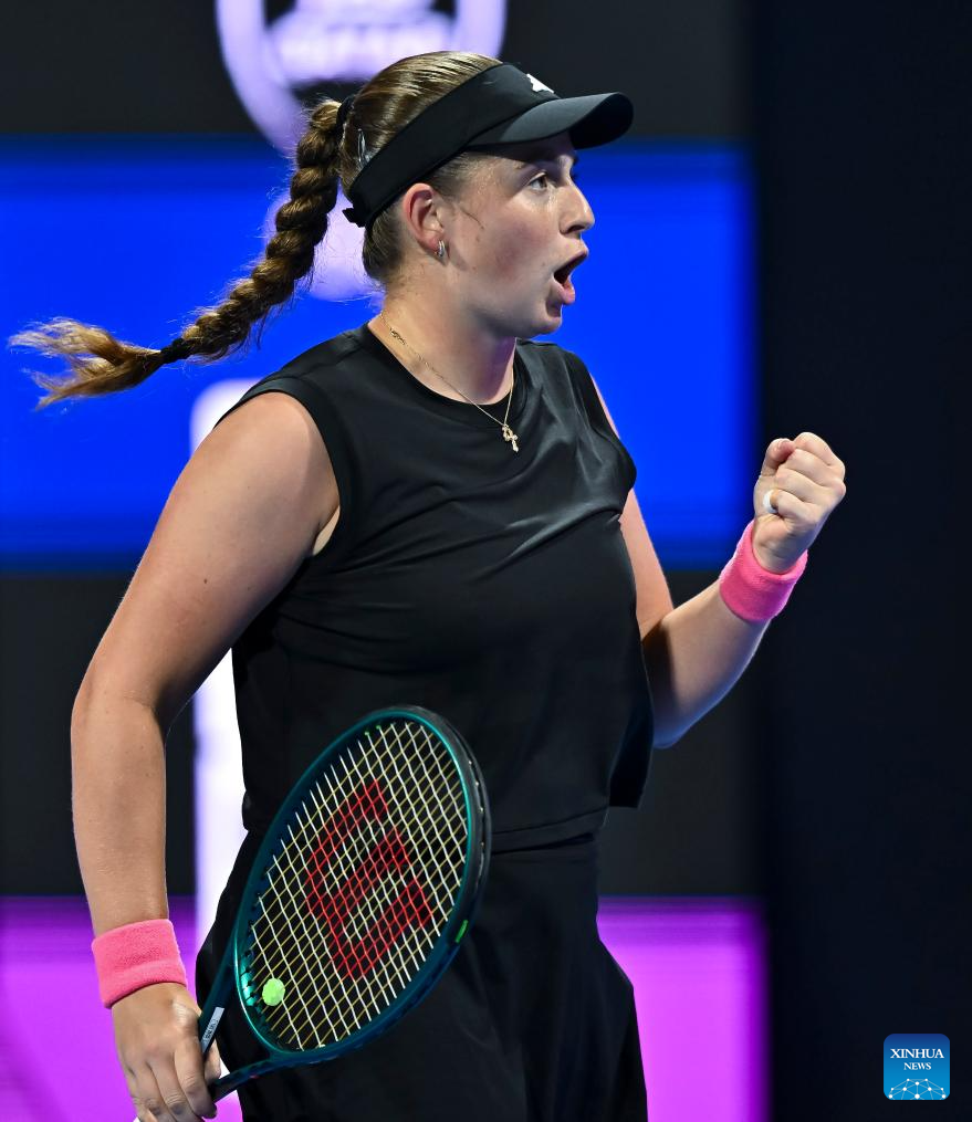 Jelena Ostapenko reacts during the women's singles semi-final match between Iga Swiatek of Poland and Jelena Ostapenko of Latvia at the WTA Qatar Open tennis tournament in Doha, Qatar, on Feb. 14, 2025. (Photo by Nikku/Xinhua)