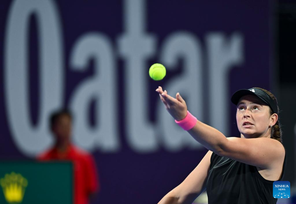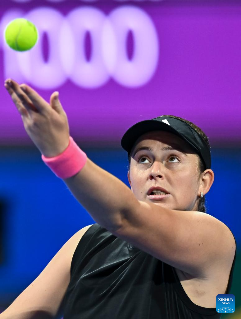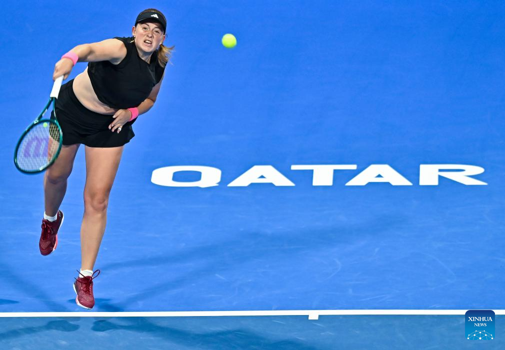 Jelena Ostapenko serves during the women's singles semi-final match between Iga Swiatek of Poland and Jelena Ostapenko of Latvia at the WTA Qatar Open tennis tournament in Doha, Qatar, on Feb. 14, 2025. (Photo by Nikku/Xinhua)