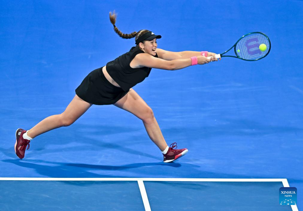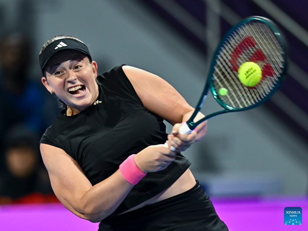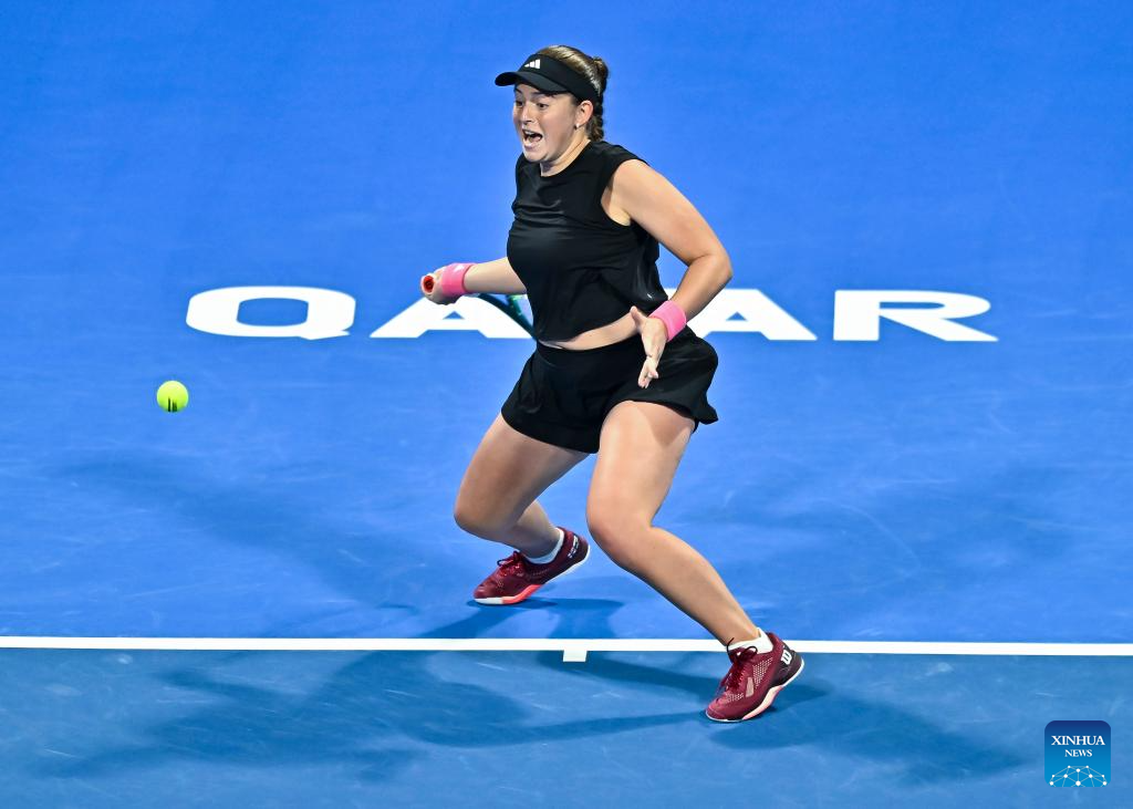 Jelena Ostapenko hits a return during the women's singles semi-final match between Iga Swiatek of Poland and Jelena Ostapenko of Latvia at the WTA Qatar Open tennis tournament in Doha, Qatar, on Feb. 14, 2025. (Photo by Nikku/Xinhua)