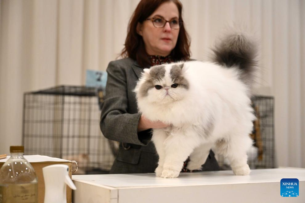 A judge checks a cat during the Kuwait Cats Show 2025 in Hawalli Governorate, Kuwait, Feb. 15, 2025. Kuwait Cats Show 2025 was held here on Friday and Saturday with the participation of more than 100 cats. (Photo by Asad/Xinhua)