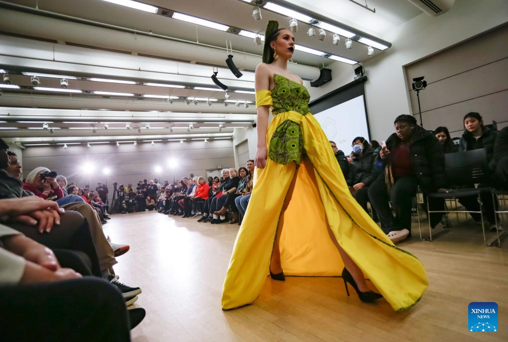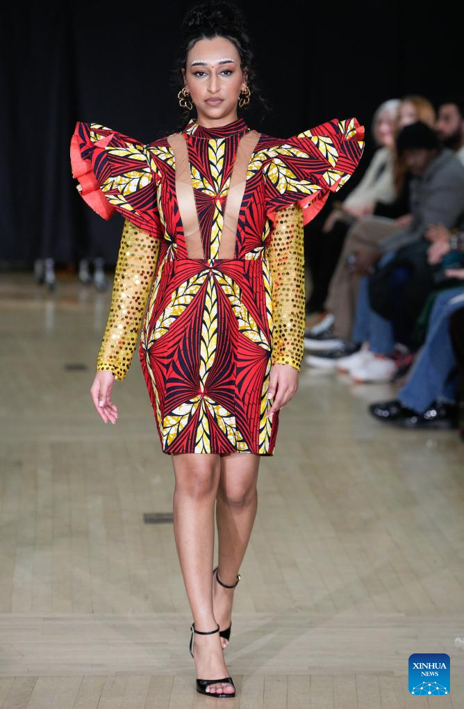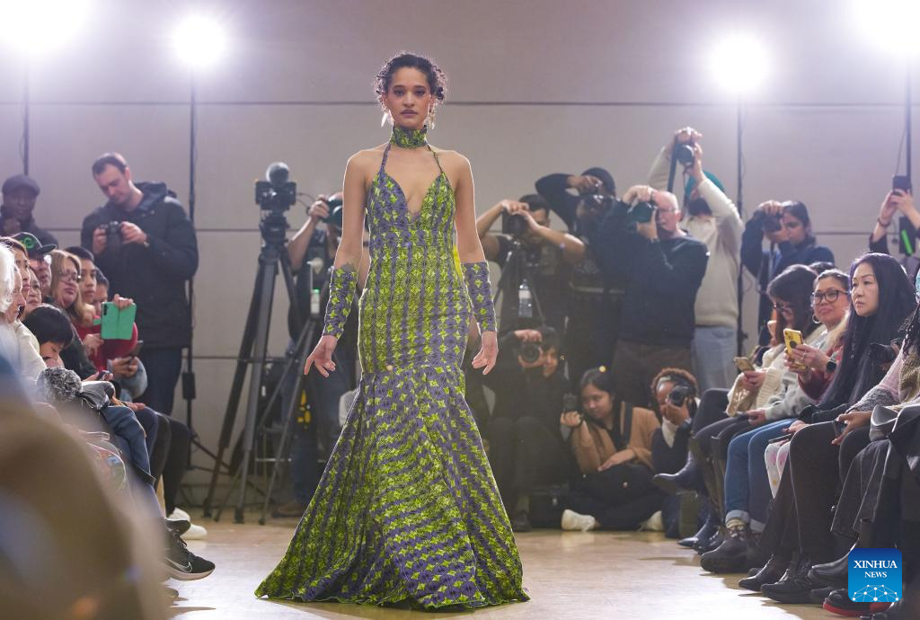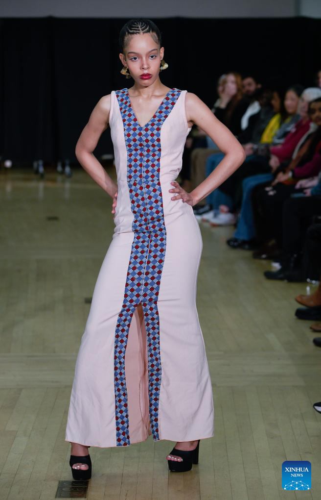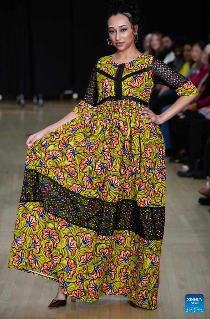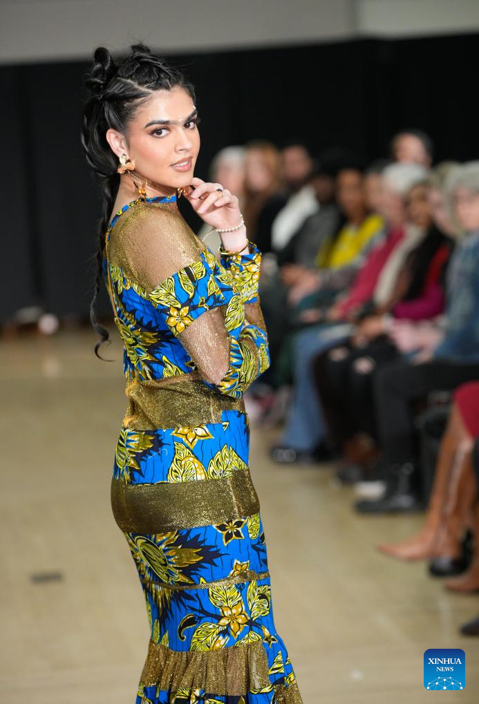 A model presents a creation during the "Heritage in Motion" fashion show in Vancouver, British Columbia, Canada, Feb. 15, 2025. (Photo by Liang Sen/Xinhua)